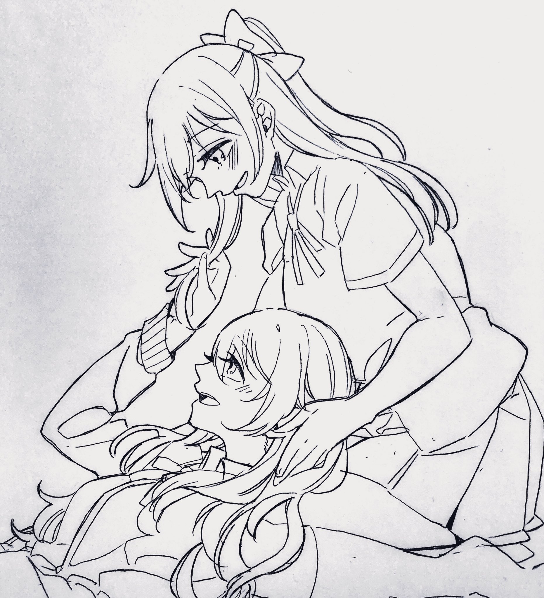 2girls blush bow character_request commentary_request greyscale hair_bow hand_in_another's_hair highres lap_pillow long_hair looking_at_another love_live! love_live!_nijigasaki_high_school_idol_club monochrome multiple_girls mygod55555 neck_ribbon osaka_shizuku parted_lips pleated_skirt ribbon seiza short_sleeves sitting skirt smile traditional_media yuri