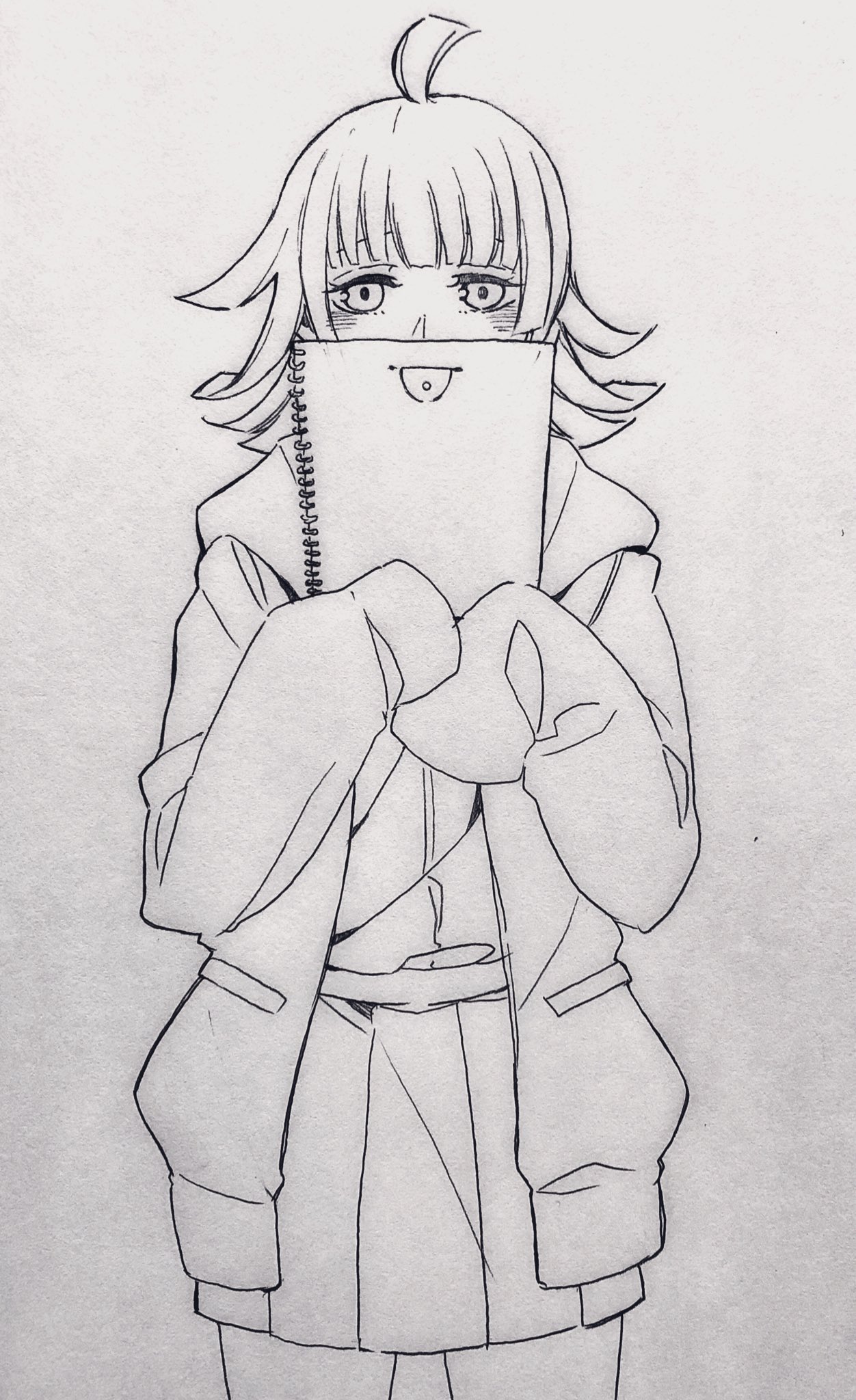 1girl blush commentary_request cowboy_shot greyscale highres long_hair long_sleeves looking_at_viewer love_live! love_live!_nijigasaki_high_school_idol_club monochrome mygod55555 piercing pleated_skirt skirt sleeves_past_wrists solo tennoji_rina tongue_piercing traditional_media