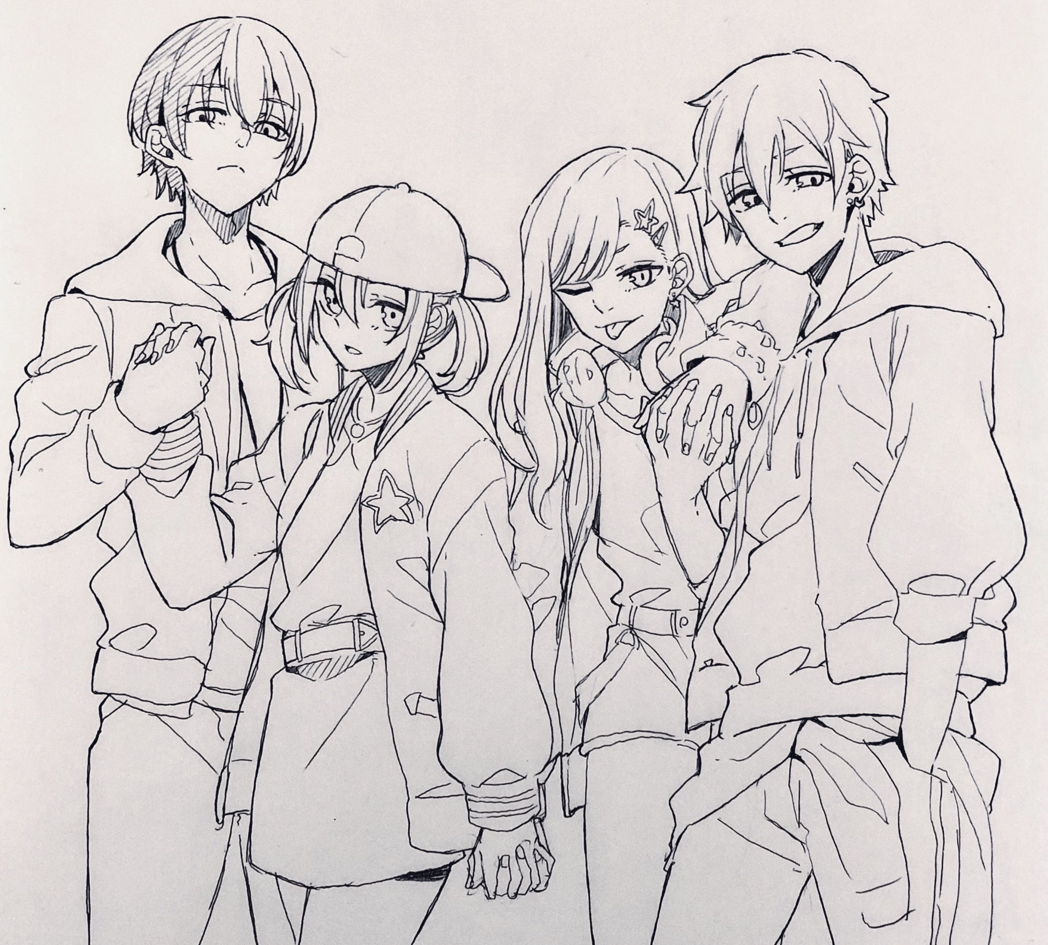 2boys 2girls aoyagi_touya azusawa_kohane baseball_cap ear_piercing greyscale grin hair_ornament hand_in_pocket hat highres holding_hands hood hoodie interlocked_fingers jacket long_sleeves looking_at_viewer monochrome multiple_boys multiple_girls mygod55555 one_eye_closed pants parted_lips piercing project_sekai shinonome_akito shiraishi_an short_hair shorts skirt smile star_(symbol) star_hair_ornament tongue tongue_out traditional_media twitter_username wonderlands_x_showtime_(project_sekai)