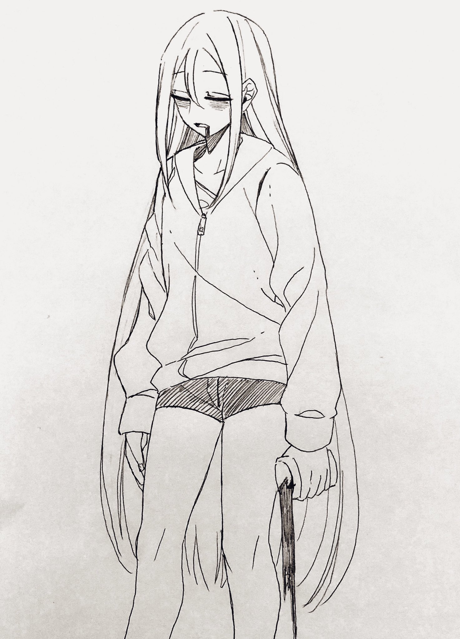 1girl bags_under_eyes closed_eyes commentary_request detached_sleeves drooling feet_out_of_frame highres holding jacket long_hair long_sleeves mygod55555 project_sekai short_shorts shorts solo spilling yoisaki_kanade zipper_pull_tab