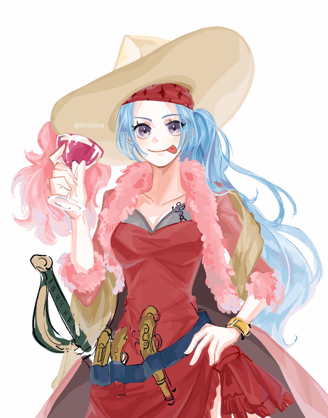 1girl 1miiiiiina :p bandana blue_hair bracelet commentary_request cowboy_shot cup fur-trimmed_jacket fur_trim hand_on_own_hip highres holding holding_cup jacket jewelry korean_commentary large_hat looking_at_viewer nefertari_vivi one_piece pink_jacket purple_eyes simple_background smile solo sword tongue tongue_out twitter_username weapon white_background