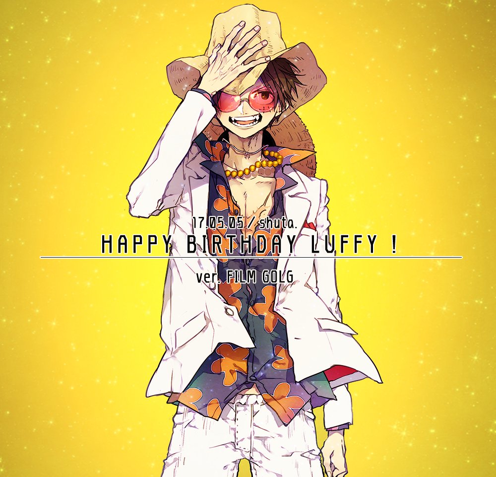 1boy achpyu black_hair character_name clenched_hand commentary_request cowboy_shot dated floral_print hand_on_headwear happy_birthday hat jacket jewelry male_focus monkey_d._luffy necklace one_piece one_piece_film:_gold open_mouth pants pearl_necklace red-tinted_eyewear smile solo straw_hat tinted_eyewear white_jacket white_pants yellow_background