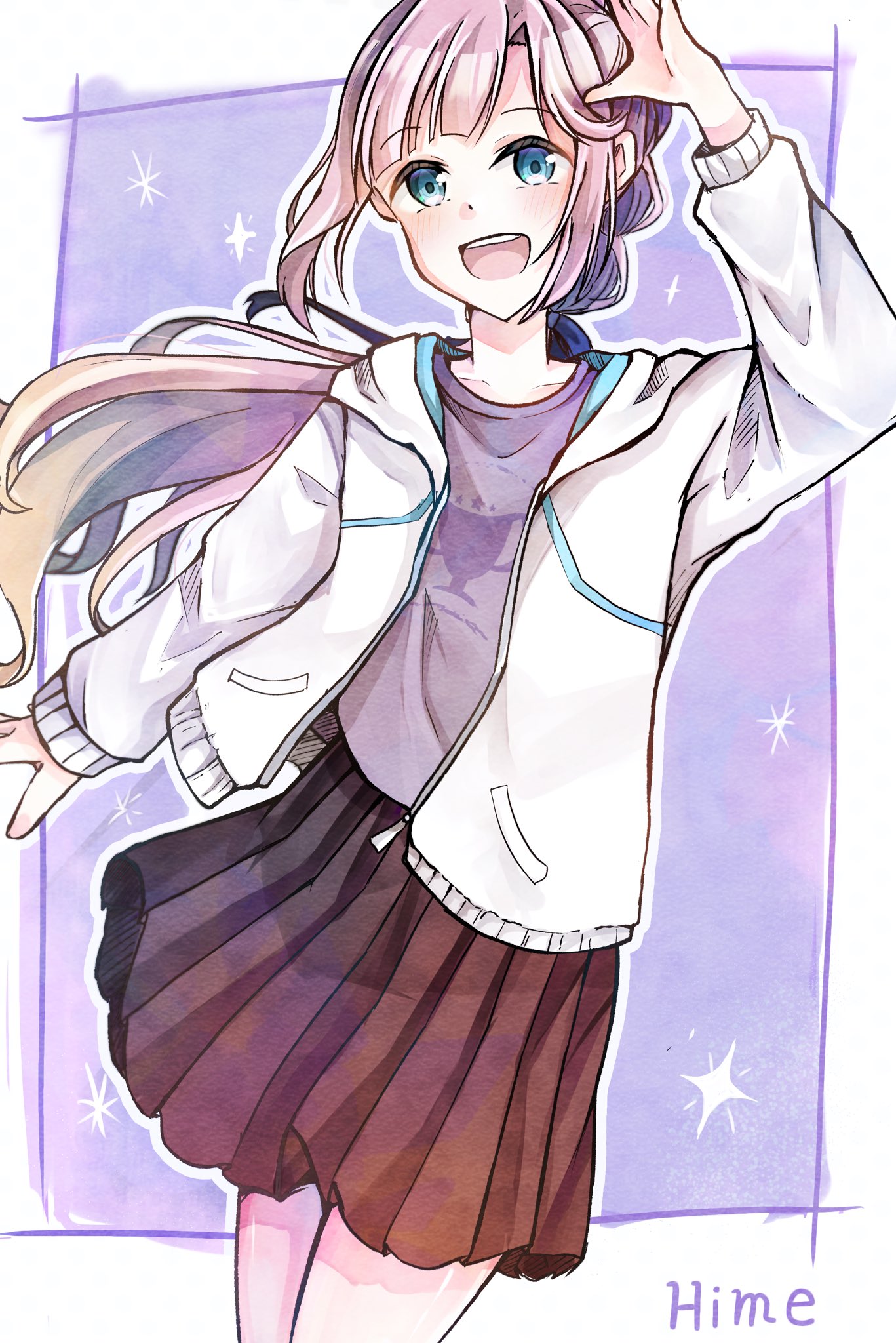 1girl :d alternate_costume anyoji_hime arm_up black_ribbon blonde_hair blue_eyes blunt_bangs blush border character_name commentary_request cowboy_shot gradient_hair hair_ribbon highres hood hood_down hooded_jacket jacket link!_like!_love_live! long_hair long_sleeves looking_at_viewer love_live! miniskirt multi-tied_hair multicolored_hair open_clothes open_jacket open_mouth outside_border pink_hair pleated_skirt ponytail purple_background purple_shirt ribbon shirt sidelocks skirt smile solo swept_bangs teeth tumugi06hana upper_teeth_only very_long_hair virtual_youtuber white_border white_jacket