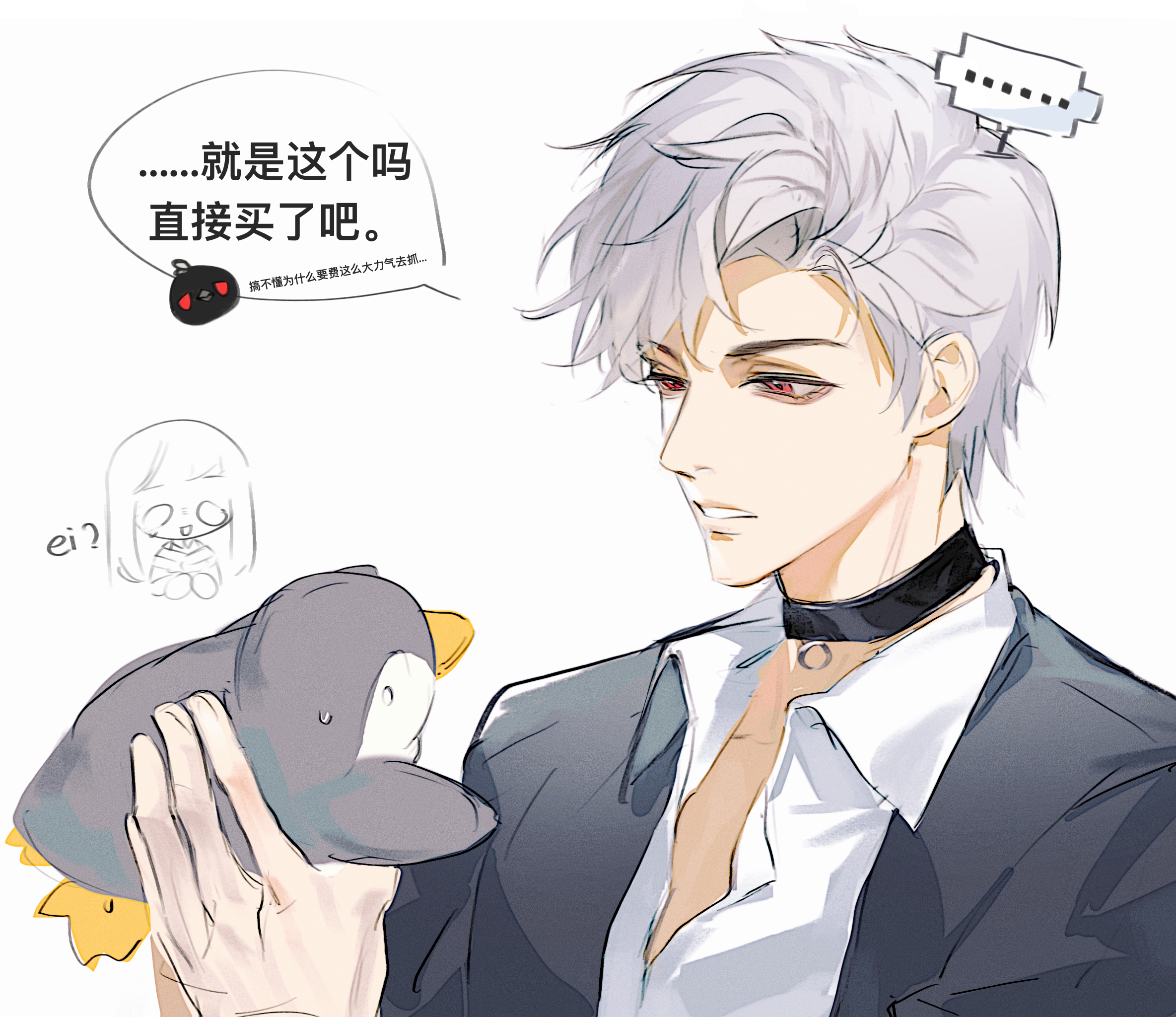 ... 1boy 1girl black_choker chinese_commentary chinese_text choker collared_shirt commentary_request eygaa grey_hair grey_jacket highres holding holding_stuffed_toy holding_toy jacket looking_at_object love_and_deepspace male_focus open_clothes open_jacket parted_bangs parted_lips protagonist_(love_and_deepspace) red_eyes shirt short_hair simplified_chinese_text solo_focus speech_bubble spoken_ellipsis stuffed_animal stuffed_penguin stuffed_toy sylus_(love_and_deepspace) talking toy translation_request white_shirt