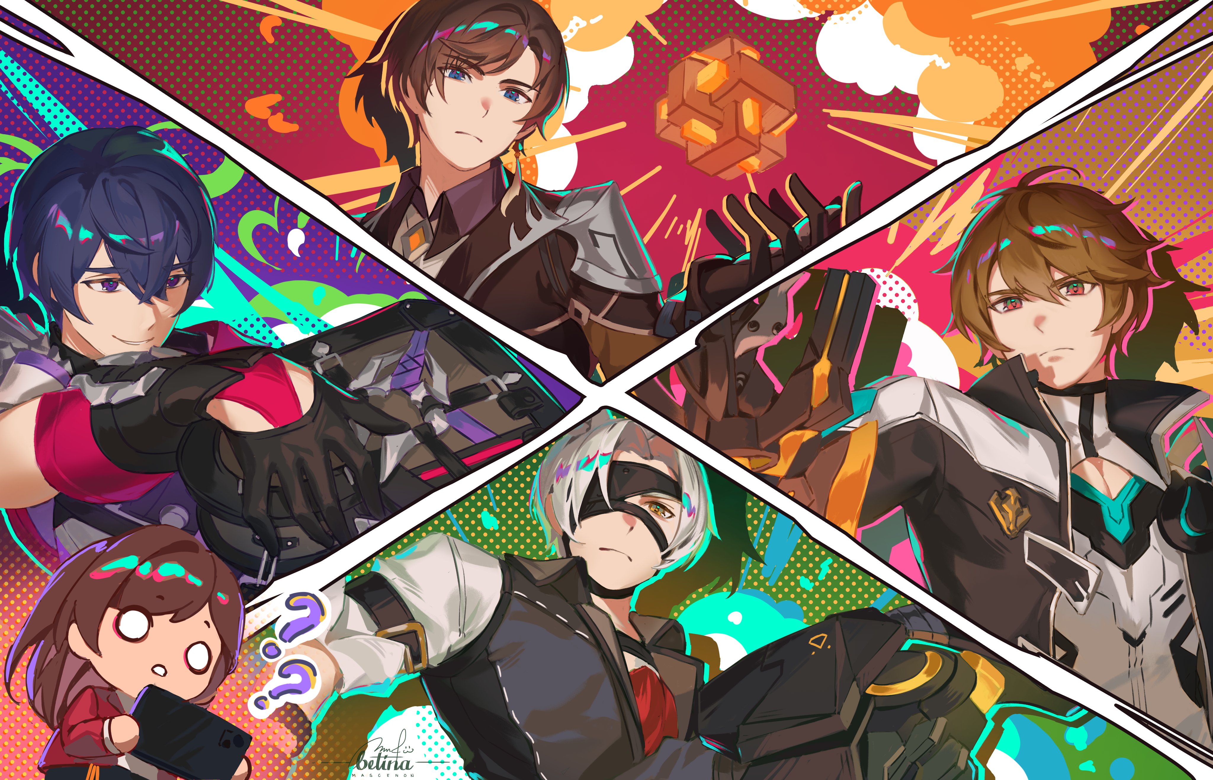 1girl 4boys ? ?? absurdres ahoge april_fools artem_wing_(tears_of_themis) betina_mascenon black_coat black_gloves black_pants black_shirt black_vest blue_eyes brown_coat brown_eyes brown_hair closed_mouth coat commentary company_connection cosplay crossover english_commentary eyepatch genshin_impact gloves highres honkai:_star_rail honkai_(series) honkai_impact_3rd jacket kevin_kaslana kevin_kaslana_(cosplay) long_hair long_sleeves looking_at_viewer luke_pearce_(tears_of_themis) marius_von_hagen_(tears_of_themis) mihoyo multiple_boys o_o open_mouth pants purple_eyes purple_hair red_jacket rosa_(tears_of_themis) shirt short_hair surprised tears_of_themis vest von_lycaon von_lycaon_(cosplay) vyn_richter_(tears_of_themis) white_hair white_shirt yellow_eyes zenless_zone_zero zhongli_(genshin_impact) zhongli_(genshin_impact)_(cosplay)