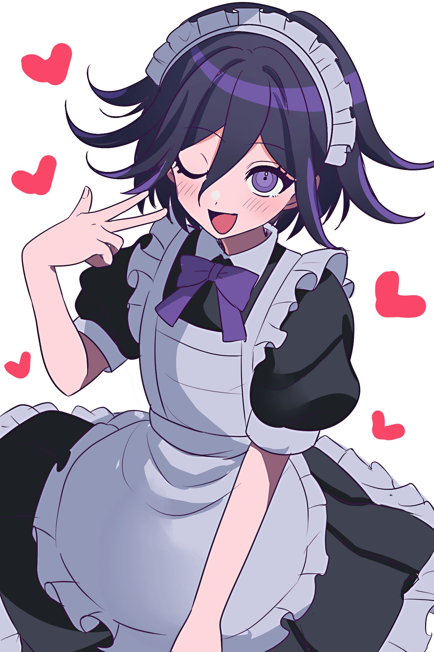 1boy :d alternate_costume androgynous apron black_dress black_hair cowboy_shot crossdressing crossdressing_(mtf) danganronpa_(series) danganronpa_v3:_killing_harmony doodle_inset dot_nose double-parted_bangs dress enmaided frilled_dress frilled_hairband frills hair_between_eyes hairband hand_up highres inward_v light_blush looking_up maid male_focus male_maid multicolored_hair neck_ribbon oma_kokichi one_eye_closed open_mouth puffy_short_sleeves puffy_sleeves purple_eyes purple_hair purple_ribbon ribbon short_sleeves smile streaked_hair urami0310 v white_apron white_background white_hairband white_trim