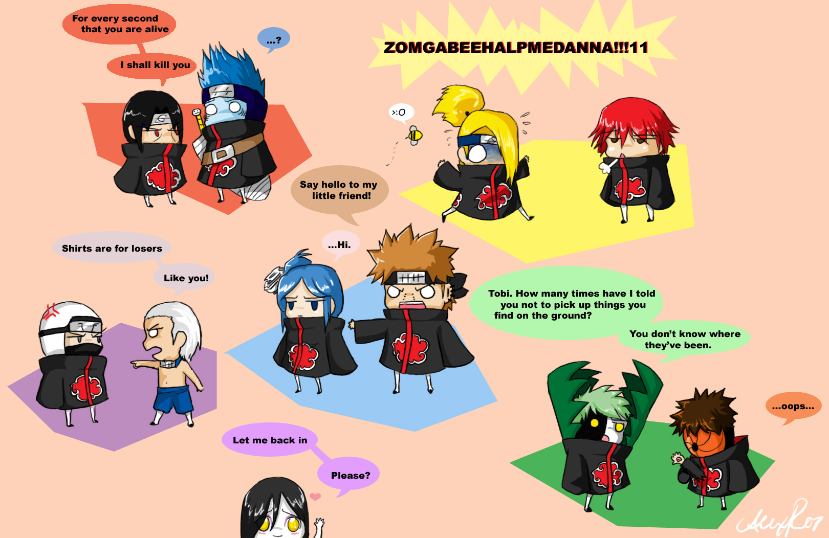 ...? 1girl akatsuki_(naruto) akatsuki_uniform anger_vein bee black_hair blonde_hair blue_hair blue_pants blue_skin blush brown_hair bug colored_skin crow213 dark-skinned_male dark_skin deidara_(naruto) disembodied_hand eyeliner flower flower_on_head forehead_protector gills green_hair grey_hair hair_ornament hair_over_one_eye heart hidan_(naruto) highres hoshigaki_kisame insect kakuzu_(naruto) konan_(naruto) makeup mask multicolored_skin multiple_boys nagato_(naruto) naruto_(series) naruto_shippuuden no_shirt orange_hair orochimaru_(naruto) pain_(naruto) pale_skin pants piercing pointing red_hair sasori_(naruto) scared speech_bubble spiked_hair tobi_(naruto) uchiha_itachi uchiha_obito weapon weapon_on_back yellow_eyes zetsu_(naruto)