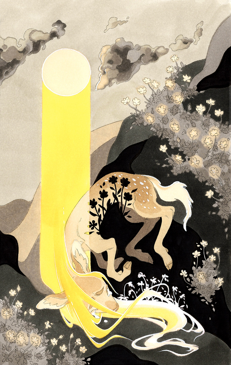 1other animal animal_focus baby_animal black_flower blonde_hair brown_fur closed_eyes cloud crying deer dutch_angle fawn fleebites flower grey_flower grey_sky highres hill light_rays muted_color no_humans on_ground original outdoors silhouette sky spot_color sun sunlight white_flower yellow_flower yellow_light