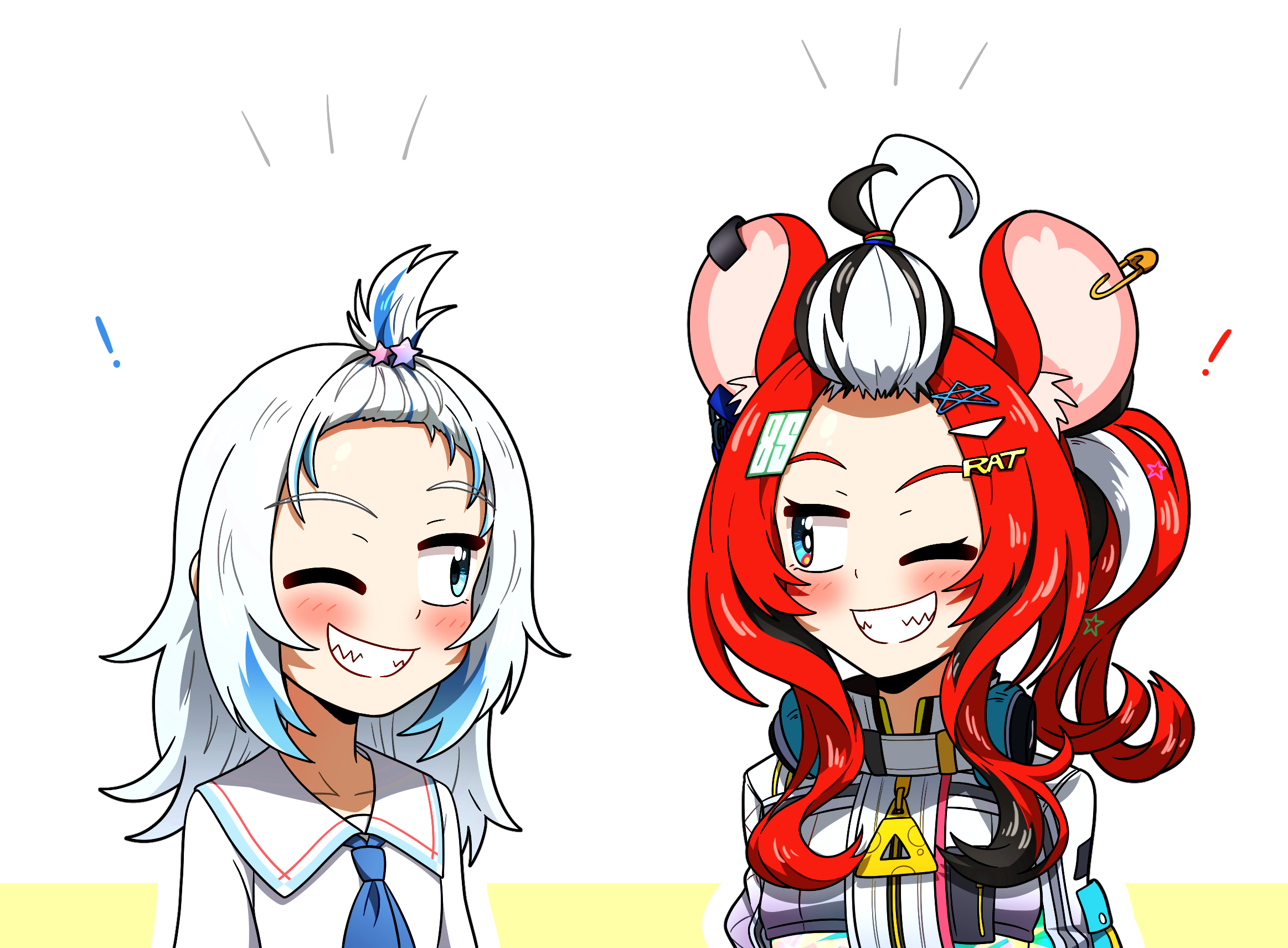 2girls ;d animal_ears bangs_pinned_back blue_hair blue_neckerchief commentary ddolbang english_commentary eye_contact gawr_gura gawr_gura_(school_uniform) grin hairband hakos_baelz hakos_baelz_(casual) headphones headphones_around_neck highres hololive hololive_english jacket looking_at_another mouse_ears multicolored_hair multiple_girls neckerchief official_alternate_hairstyle one_eye_closed open_mouth red_hairband sharp_teeth shirt smile streaked_hair teeth upper_body virtual_youtuber white_hair white_jacket white_shirt