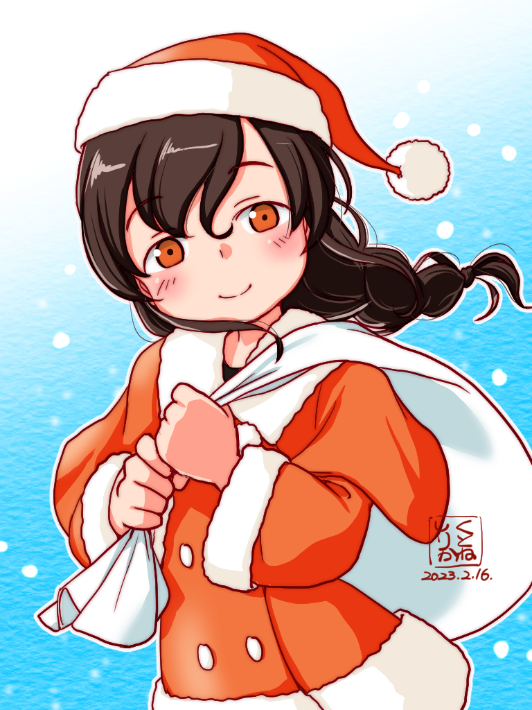 1girl artist_logo black_hair blue_background braid dated dress fur-trimmed_dress fur-trimmed_headwear fur_trim hat kantai_collection kutone_shirika logo long_hair looking_at_viewer official_alternate_costume orange_dress orange_eyes orange_hat sack santa_costume santa_hat single_braid solo souya_(christmas)_(kancolle) souya_(kancolle) souya_agb_(kancolle)