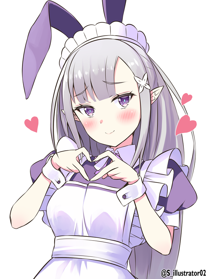 1girl four-finger_heart_hands alternate_costume animal_ears apron blush breasts dress elf emilia_(re:zero) fake_animal_ears frilled_apron frills hair_ornament heart heart_hands long_hair looking_at_viewer low_ponytail maid maid_apron maid_headdress medium_breasts pointy_ears ponytail puffy_sleeves purple_dress purple_eyes rabbit_ears re:zero_kara_hajimeru_isekai_seikatsu s_(hdru2332) smile solo twitter_username upper_body white_background white_hair wrist_cuffs x_hair_ornament