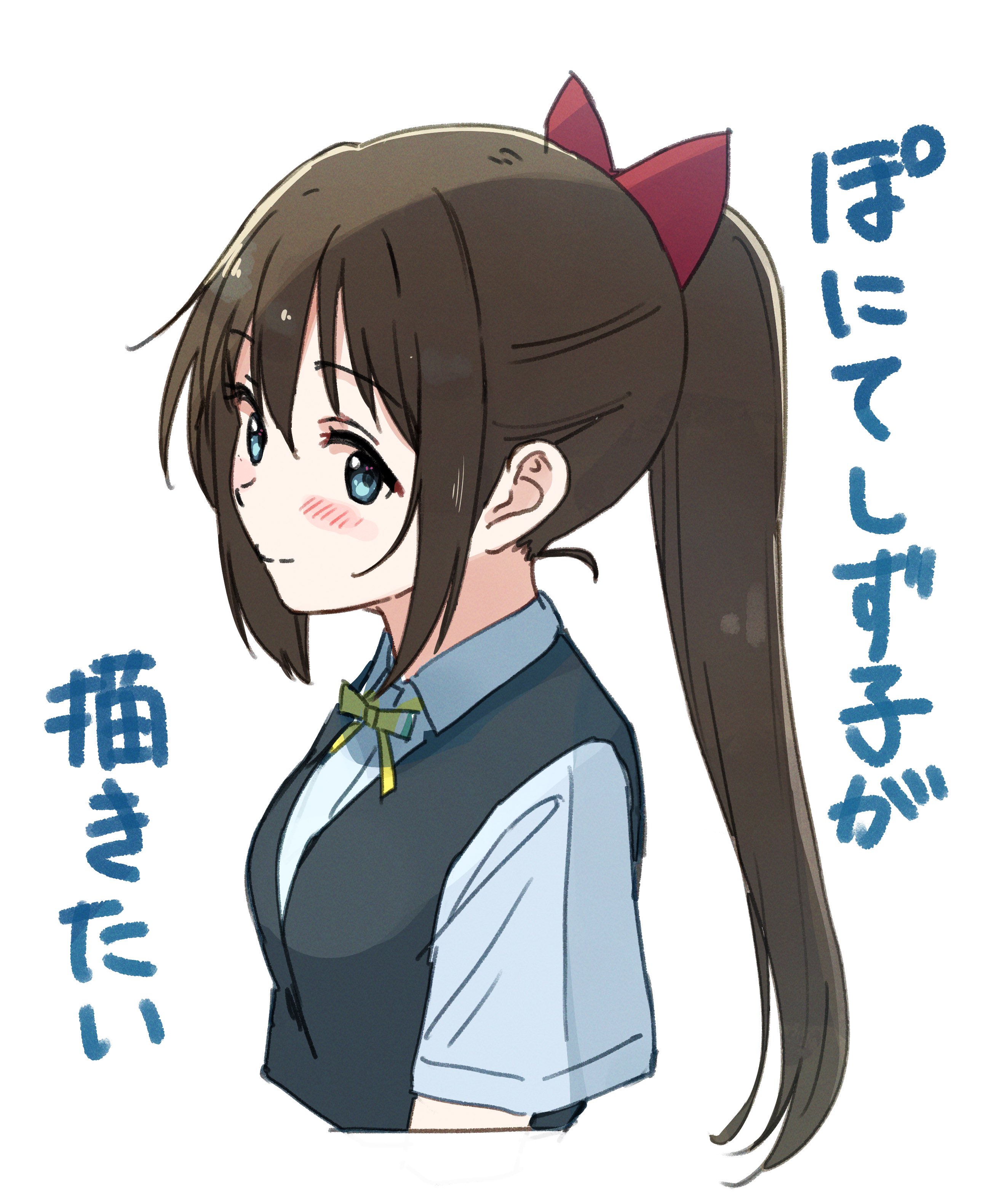 1girl absurdres alternate_hairstyle black_vest blue_eyes blue_shirt blush bow brown_hair closed_mouth collared_shirt cropped_torso dress_shirt hair_bow highres lone_nape_hair long_hair looking_at_viewer love_live! love_live!_nijigasaki_high_school_idol_club neck_ribbon nijigasaki_school_uniform osaka_shizuku ponytail red_bow ribbon school_uniform shirt sidelocks simple_background smile solo split_mouth summer_uniform tata_(tataice) translation_request upper_body vest white_background yellow_ribbon
