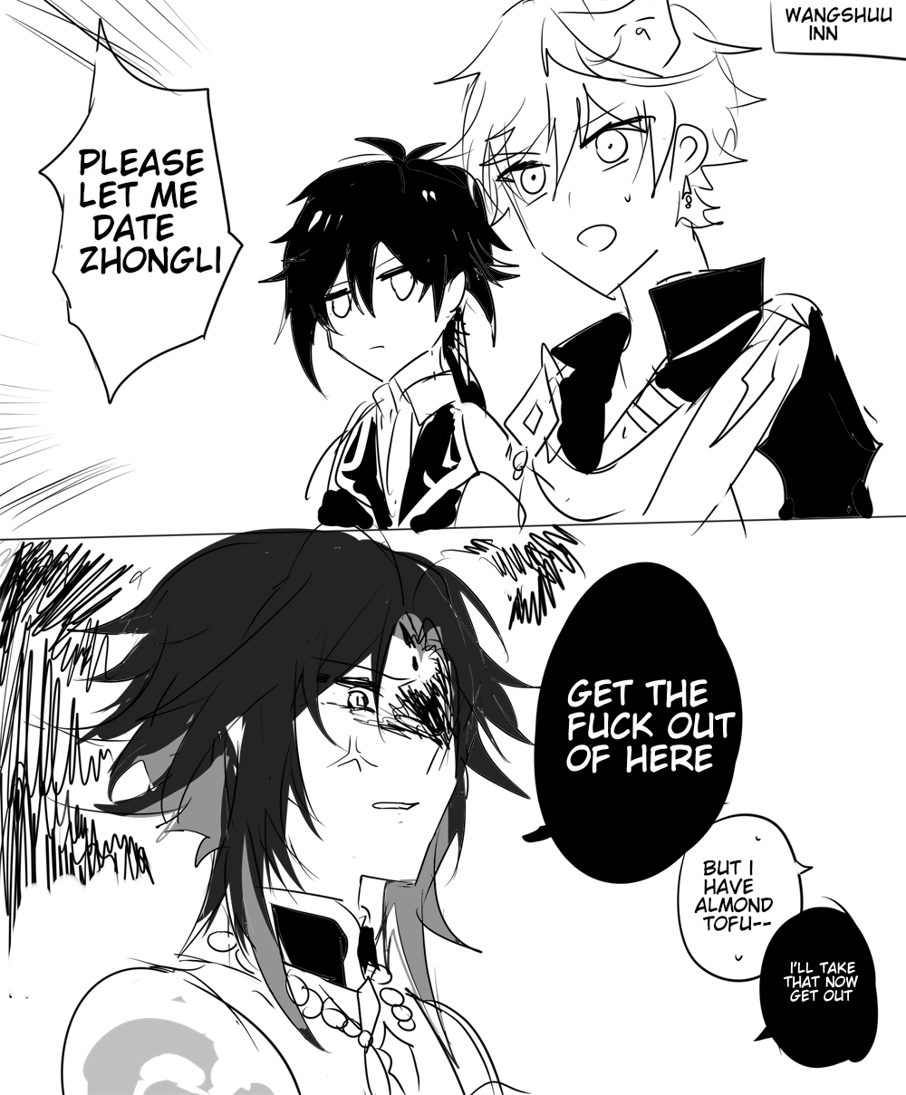 3boys anger_vein profanity efu_(angelschatedral99) english_text genshin_impact greyscale highres monochrome multiple_boys speech_bubble tartaglia_(genshin_impact) white_background xiao_(genshin_impact) yaoi zhongli_(genshin_impact)