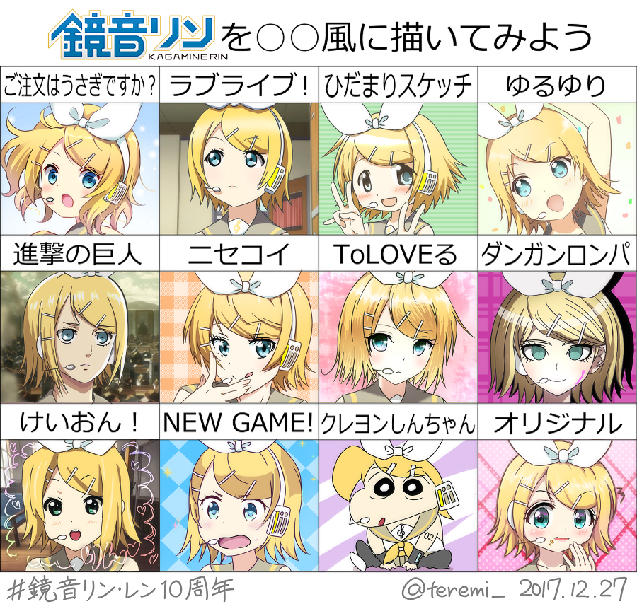 1girl blonde_hair blue_eyes commentary_request crayon_shin-chan danganronpa_(series) dated double_v expressionless gochuumon_wa_usagi_desu_ka? grey_sailor_collar hair_ornament hairclip headset hidamari_sketch k-on! kagamine_rin love_live! new_game! nisekoi open_mouth parody sailor_collar shingeki_no_kyojin smile style_parody style_request teremi to_love-ru tongue tongue_out translation_request twitter_username v vocaloid yuruyuri