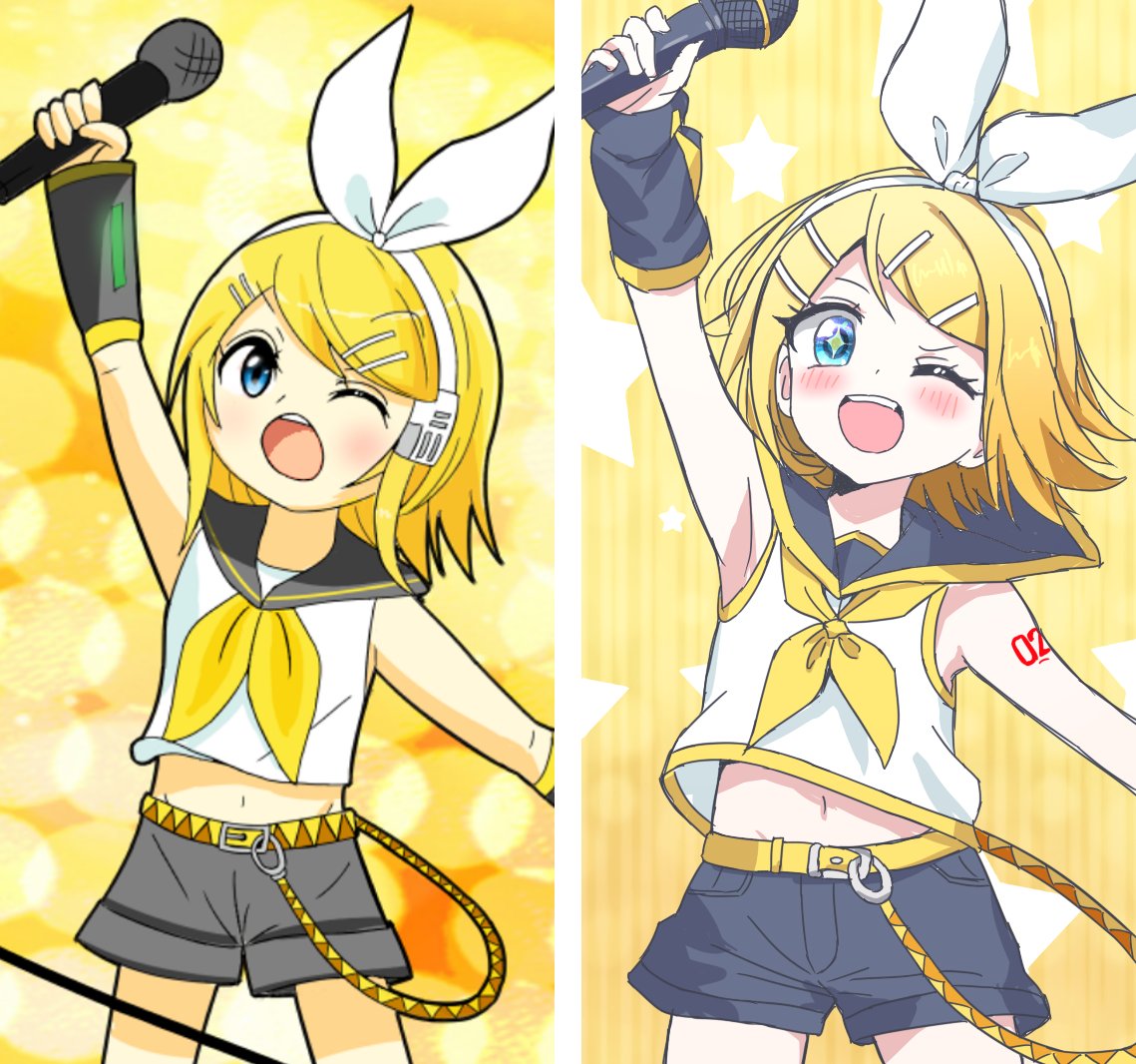 +_+ 1girl artist_progress black_footwear black_sailor_collar blonde_hair blue_eyes commentary_request comparison hair_ornament hairband hairclip holding holding_microphone kagamine_rin medium_hair microphone navel number_tattoo one_eye_closed open_mouth sailor_collar shirt short_shorts shorts shoulder_tattoo sleeveless sleeveless_shirt smile tattoo teremi vocaloid white_hairband