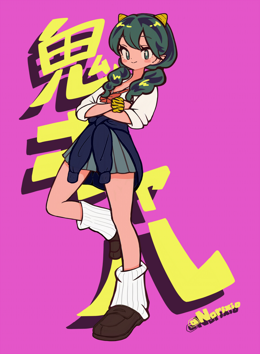 alternate_costume alternate_hairstyle animal_print artist_name bracelet braid clothes_around_waist commentary cone_horns fashion green_eyes green_hair grey_skirt gyaru highres horns jewelry long_hair lum norixio pink_background pleated_skirt pointy_ears print_bracelet shirt skirt smile standing standing_on_one_leg sweater sweater_around_waist tiger_print twin_braids urusei_yatsura white_shirt