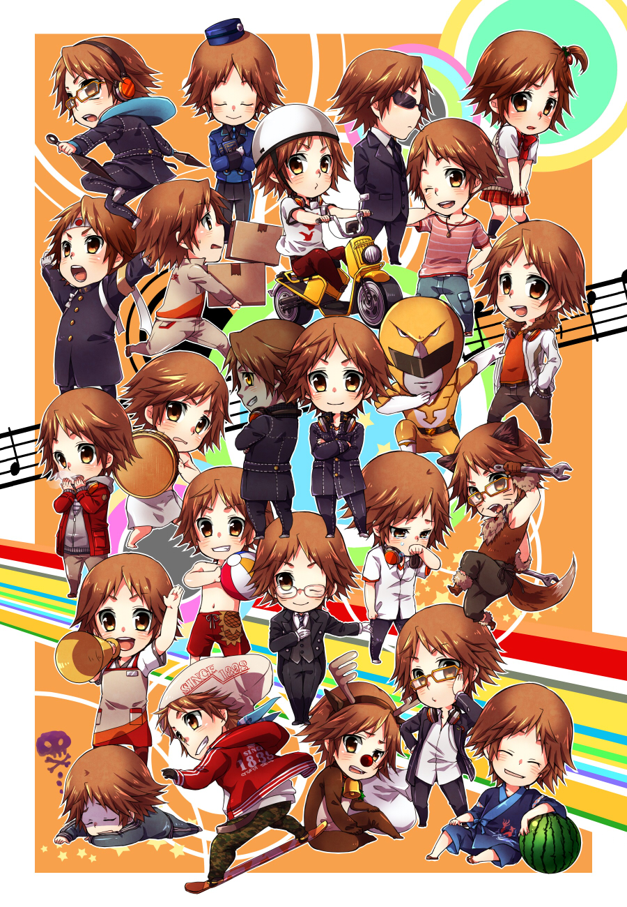 animal_costume animal_ears antlers ball beachball black_necktie bow box brown_eyes brown_footwear brown_hair bucket camouflage camouflage_pants cardboard_box chibi closed_eyes coat cosplay crossdressing crossed_arms fake_antlers food fruit glasses gloves hair_ornament hanamura_yousuke hat headphones headphones_around_neck helmet highres holding holding_ball holding_beachball holding_box holding_bucket holding_megaphone holding_weapon holding_wrench horns japanese_clothes kunai male_swimwear megaphone moped motor_vehicle musical_note necktie official_alternate_costume one_eye_closed open_mouth pants persona persona_4 persona_4_the_golden red_bow reindeer_antlers reindeer_costume school_uniform shadow_yousuke siempre skirt smile snowboard sunglasses swim_trunks tail tears theodore_(persona) theodore_(persona)_(cosplay) towel towel_around_waist watermelon weapon white_gloves winter_clothes winter_coat winter_uniform wooden_bucket wrench yasogami_school_uniform yellow-framed_eyewear yellow_eyes