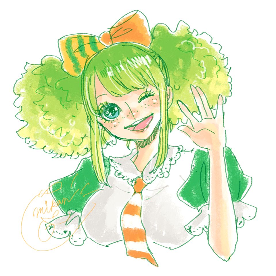 1girl ;d ann_(one_piece) bow commentary_request cropped_torso eyelashes freckles green_hair hair_bow looking_at_viewer mrnmikannn necktie one_eye_closed one_piece one_piece:_stampede open_mouth orange_necktie puffy_short_sleeves puffy_sleeves short_sleeves sidelocks signature simple_background smile solo striped_clothes striped_necktie twintails upper_body waving white_background white_necktie