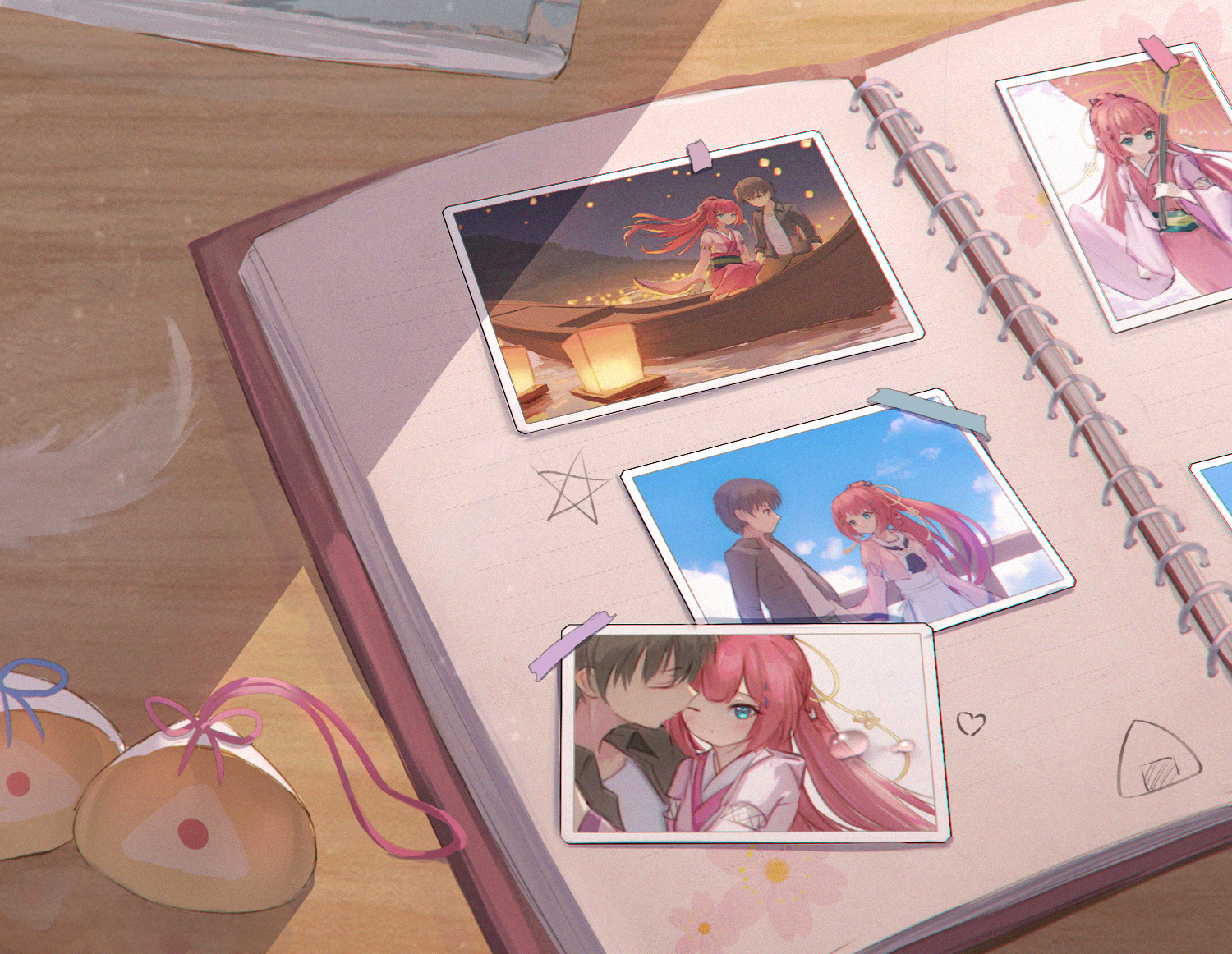 1boy 1girl ascot black_ascot blue_sky blush boat book brown_hair cherry_blossom_print commentary couple cowboy_shot dating day floating_hair floral_print food_print hair_ornament hairclip heart heart_print hetero holding holding_umbrella japanese_clothes kamiyama_shiki kimono kiss lantern lantern_festival long_hair long_sleeves looking_at_another looking_at_viewer multiple_views night oil-paper_umbrella one_eye_closed onigiri_print open_book paper_lantern photo_(object) photo_album pink_kimono ponytail red_hair school_uniform shiki_hamaguri shirt short_hair skirt sky sky_lantern star_(symbol) star_print summer_pockets takahara_hairi umbrella upper_body very_long_hair water water_drop watercraft white_shirt white_skirt wide_sleeves