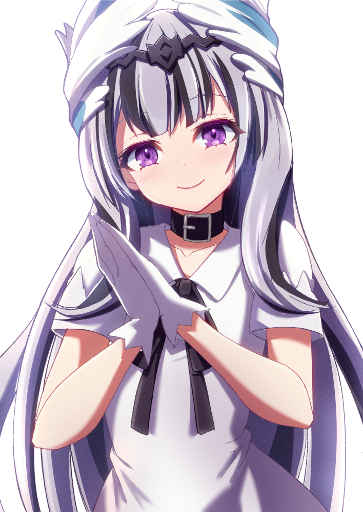 1girl black_choker black_hair blunt_bangs choker closed_mouth dress fire_emblem fire_emblem_engage gloves grey_hair hair_ornament long_hair minamonochaba multicolored_hair nintendo own_hands_together purple_eyes short_sleeves smile solo two-tone_hair upper_body veyle_(fire_emblem) white_background white_dress white_gloves wing_hair_ornament