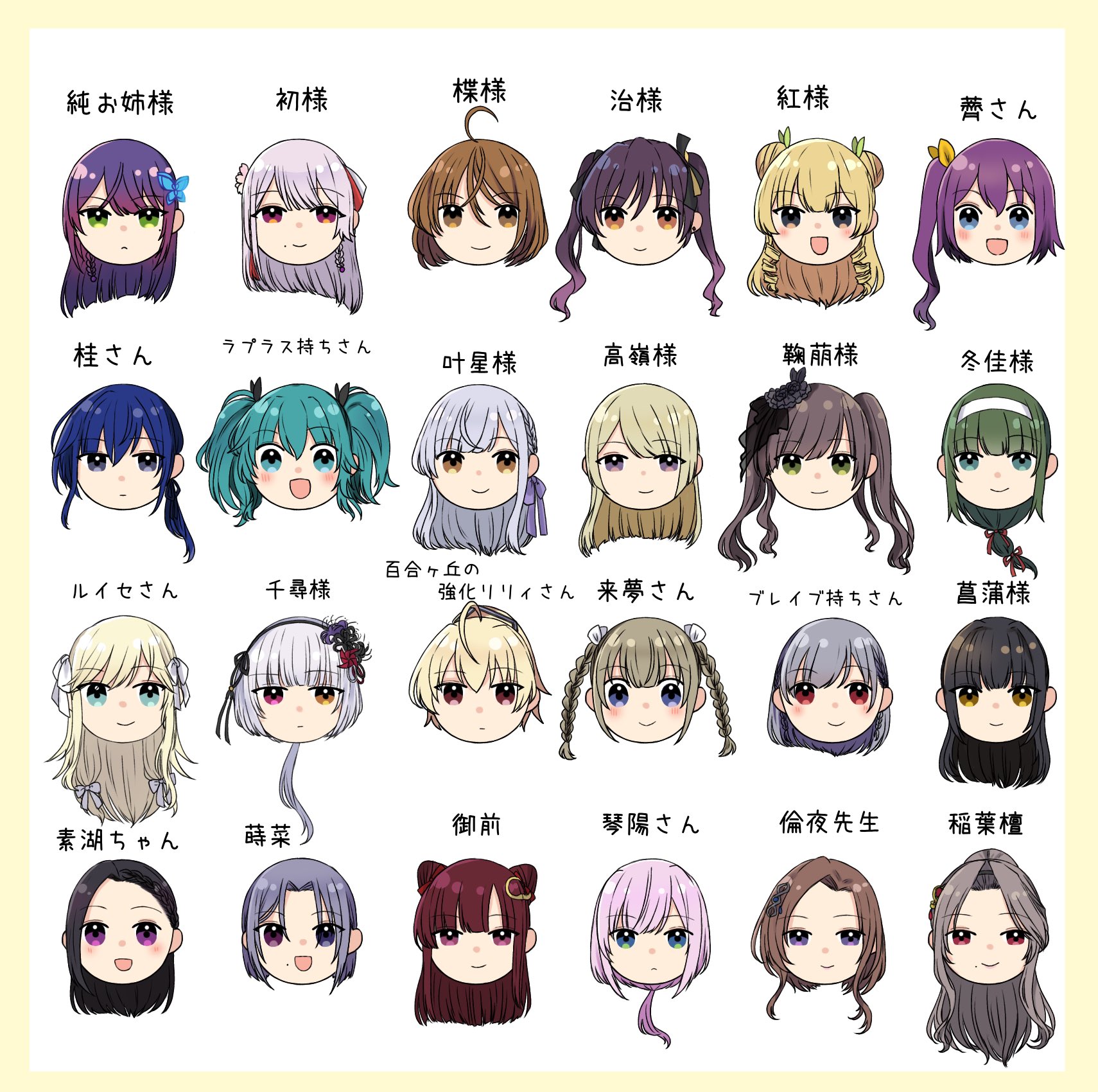 6+girls :d ahoge ando_tazusa aqua_eyes aqua_hair assault_lily black_flower black_hair black_hairband black_ribbon blonde_hair blue_eyes blue_hair blush border bow_hairband braid braided_bun brown_eyes brown_hair butterfly_hair_ornament character_name chibi closed_mouth commentary cone_hair_bun crossed_bangs double_bun drill_hair drill_sidelocks earrings flower funada_kiito funada_ui gozen_(assault_lily) green_eyes green_hair green_ribbon grey_hair hair_between_eyes hair_bun hair_flower hair_ornament hairband hasebe_touka hasegawa_gabriella_tsugumi hayami_katsura head_only heterochromia high_ponytail highres hishida_haru inaba_mayumi jewelry jin_no_hana kagawa_makina kamigoori_marimo kawamura_yuzuriha kawanabe_nazuna kishimoto_lucia_raimu kon_kanaho long_hair looking_at_viewer low-tied_long_hair low_ponytail luise_ingels miyagawa_takane mole mole_under_eye mole_under_mouth multiple_girls nakahara_mary_tomoyo nigari_(ngari_0115) open_mouth orange_ribbon parted_bangs pink_eyes pink_flower pink_hair ponytail purple_eyes purple_flower purple_hair purple_ribbon red_eyes red_flower red_hair red_ribbon ribbon saigou_kurena shin_no_hana short_hair siblings side_braid side_ponytail sidelocks simple_background single_braid sisters smile stud_earrings suzuki_chinami tassel tassel_hair_ornament toda_eulalia_kotohi translated twin_braids twintails white_background white_hairband white_ribbon yamaguchi_chihiro_(assault_lily) yellow_border yellow_eyes yellow_ribbon