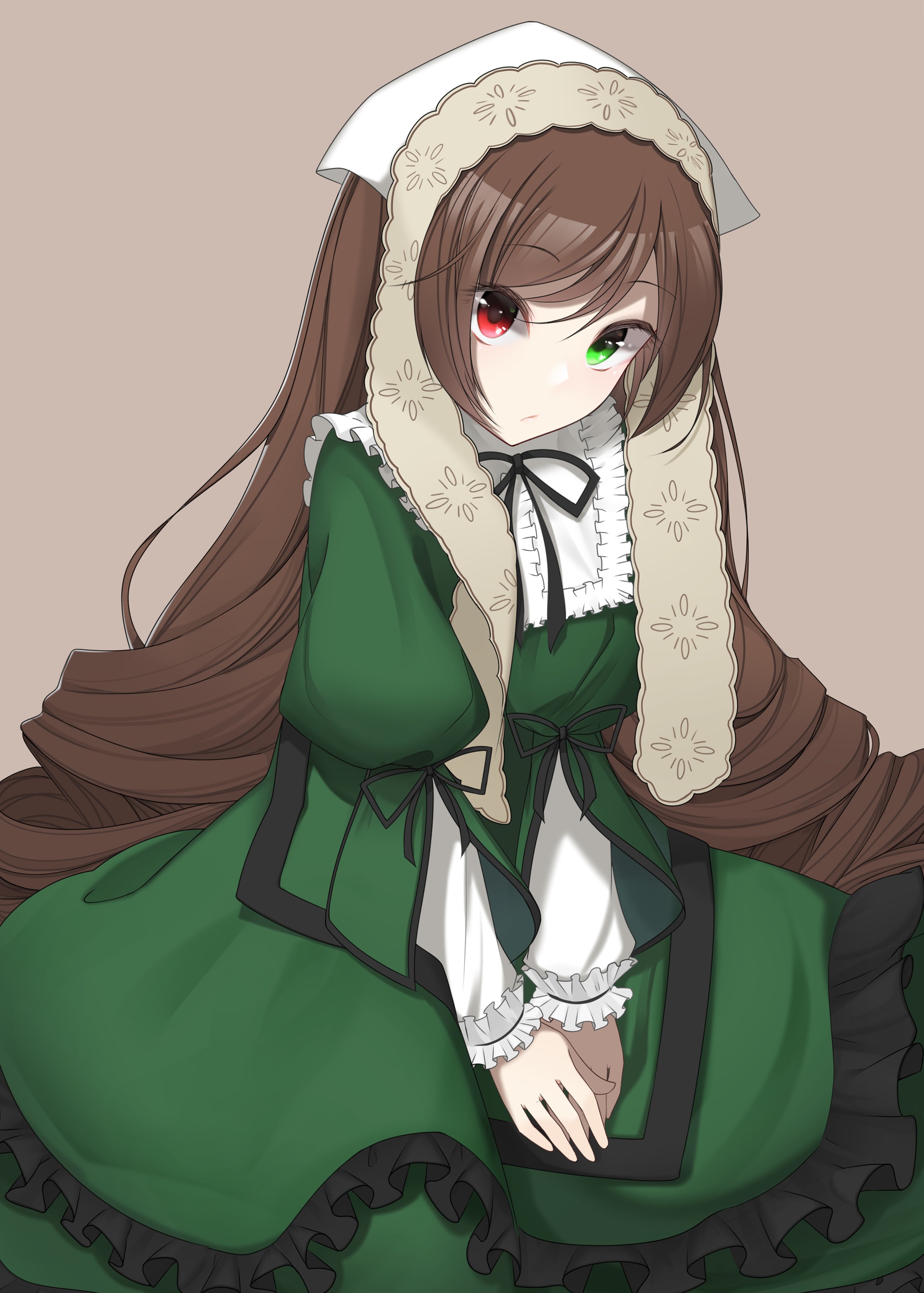1girl absurdres accurate_lolita_coord black_ribbon blush brown_background brown_hair classic_lolita closed_mouth coif collared_dress commentary_request cowboy_shot dress expressionless frilled_dress frilled_shirt_collar frills green_dress green_eyes headscarf heterochromia highres ise_dango juliet_sleeves lappet lolita_fashion long_dress long_hair long_sleeves looking_at_viewer neck_ribbon own_hands_together puffy_sleeves red_eyes ribbon rozen_maiden simple_background solo suiseiseki very_long_hair white_headscarf