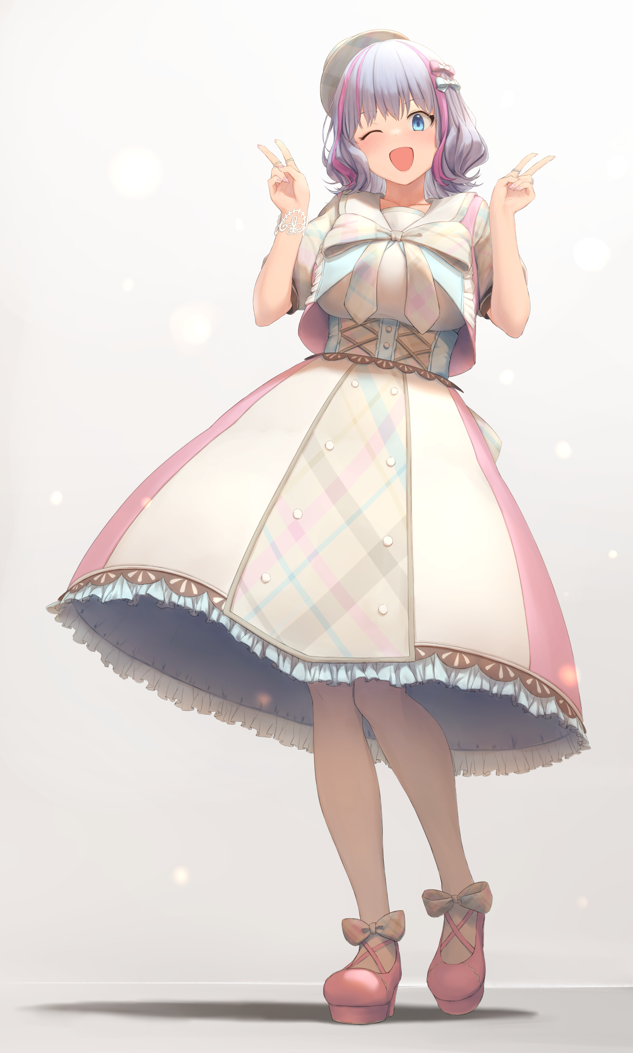 1girl blush bow breasts dolphin_wave double_v dress enoshito frilled_dress frills full_body hair_bow hat highres jewelry kukuri_tomo large_breasts looking_at_viewer multicolored_hair multiple_rings one_eye_closed open_mouth pink_hair pink_shoes purple_hair ring shoes short_sleeves simple_background solo standing v