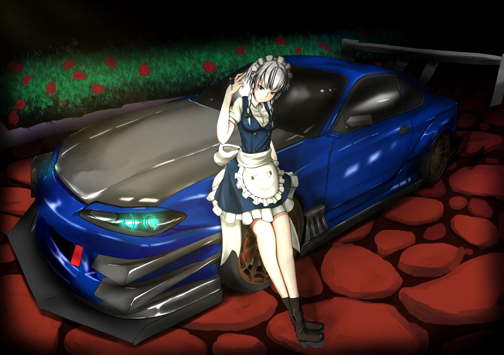 1girl apron black_boots blue_car blue_dress boots braid breasts car collared_shirt crossed_legs dress grey_hair head_tilt izayoi_sakuya maid_headdress mon_mo_ran-shi motor_vehicle nissan nissan_silvia nissan_silvia_s15 shirt small_breasts solo spoiler_(automobile) sports_car touhou twin_braids vehicle_focus waist_apron white_shirt
