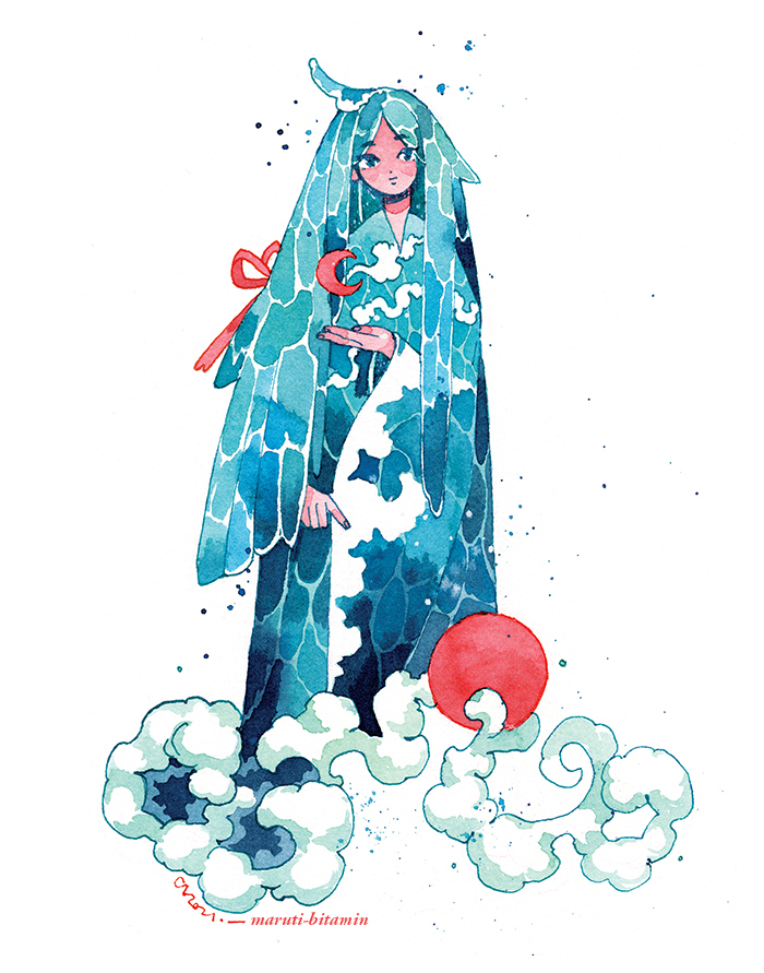 1girl artist_name blue_dress blue_eyes blue_hair bow caustics colored_skin crescent_moon dress layered_clothes liquid_hair long_dress long_hair long_sleeves looking_at_viewer loose_clothes maruti_bitamin moon object_floating_above_hand ocean original painting_(medium) pink_skin red_bow red_sun shaped_liquid simple_background solo sun sunset traditional_media very_long_hair water watercolor_(medium) wave_print waves white_background