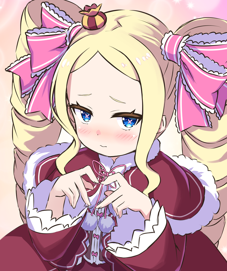 1girl four-finger_heart_hands beatrice_(re:zero) blonde_hair blue_eyes blush capelet crown dress drill_hair fur-trimmed_capelet fur_trim hair_ribbon heart_hands long_hair long_sleeves looking_at_viewer pink_pupils pink_ribbon re:zero_kara_hajimeru_isekai_seikatsu red_capelet red_dress ribbon s_(hdru2332) smile solo symbol-shaped_pupils twin_drills twintails upper_body