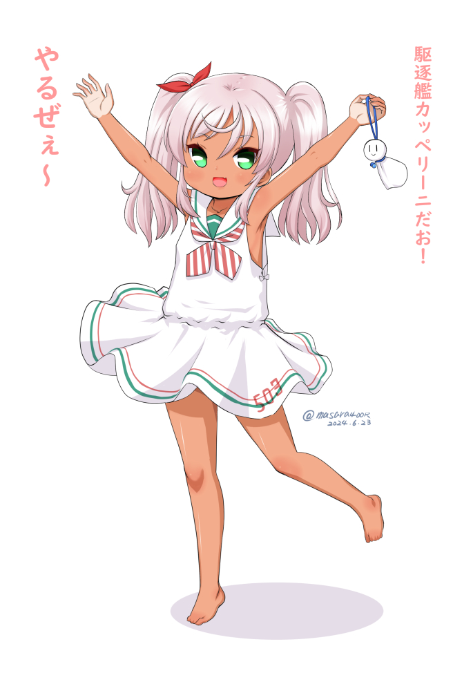 1girl barefoot comandante_cappellini_(kancolle) commentary_request cosplay dark-skinned_female dark_skin dated dress full_body green_eyes kantai_collection libeccio_(kancolle) libeccio_(kancolle)_(cosplay) long_hair low-cut_armhole masara_(chuujou) neckerchief pink_eyes red_neckerchief sailor_collar sailor_dress side-tie_dress sleeveless sleeveless_dress solo striped_neckerchief tan tanline teruterubouzu translation_request twintails twitter_username white_dress white_sailor_collar