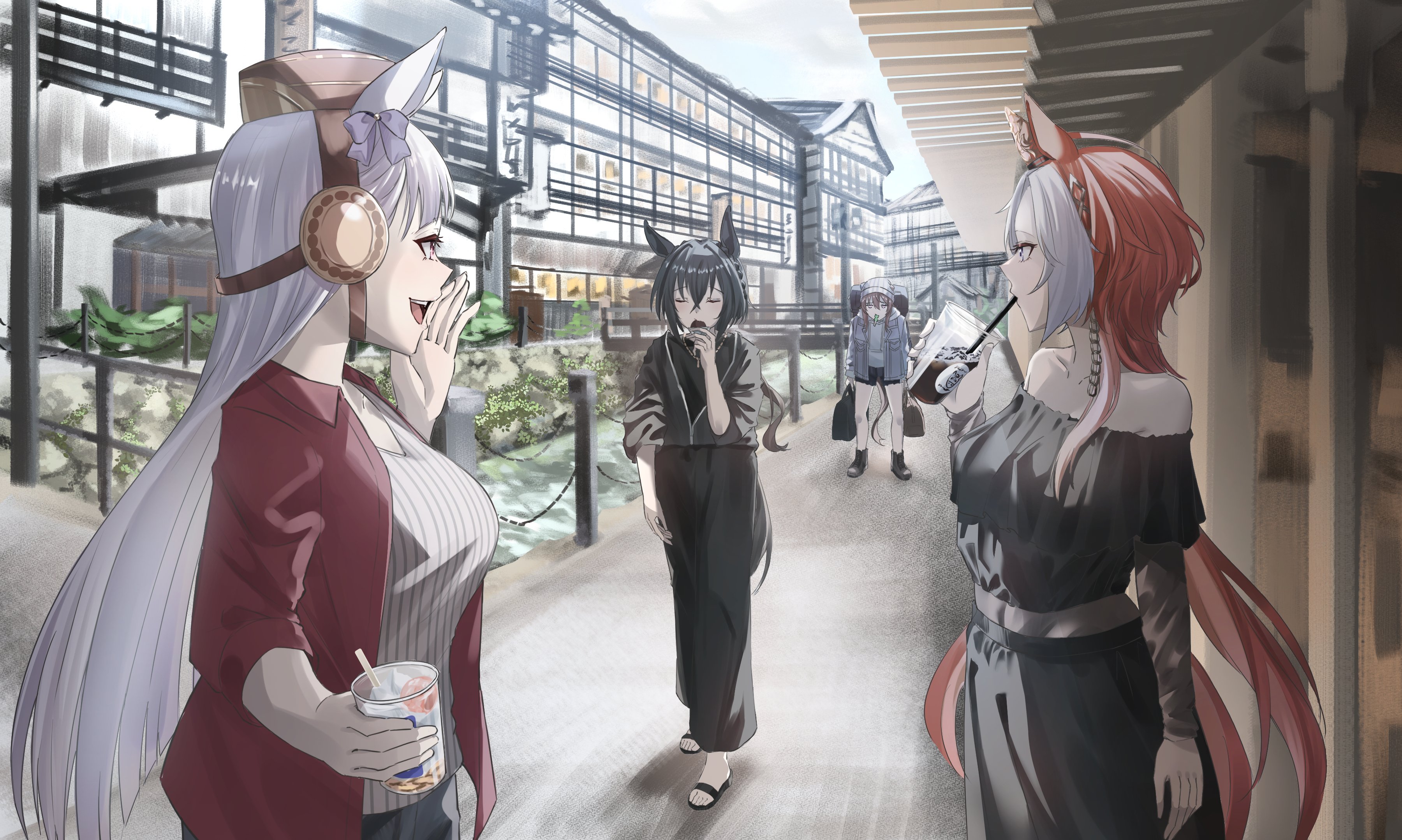 4girls absurdres animal_ears bag beanie black_boots black_jacket black_pants black_sandals black_shirt black_shorts boots bow breasts closed_eyes commentary cup disposable_cup ear_bow gold_ship_(umamusume) grey_hair grey_hat grey_jacket hair_intakes hakekeke2525 hat highres holding holding_bag holding_cup hood hooded_sweater horse_ears horse_girl horse_tail jacket kin'iro_ryotei_(umamusume) large_breasts long_hair multicolored_hair multiple_girls nakayama_festa_(umamusume) orange_hair orfevre_(umamusume) pants pillbox_hat purple_bow purple_eyes red_jacket ribbed_sweater sandals shirt shorts sweater tail two-tone_hair umamusume umamusume_horse_relations white_hair