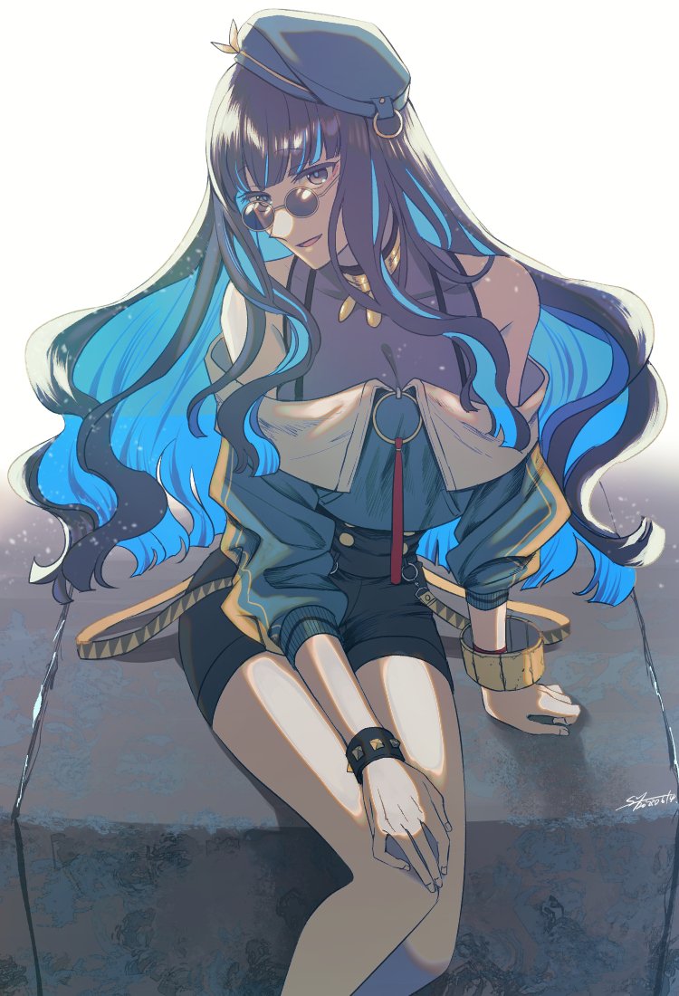 1girl beret blue-tinted_eyewear bracelet buttons colored_inner_hair double-breasted fate/grand_order fate_(series) green_hat green_jacket grey_eyes hat jacket jewelry looking_at_viewer looking_over_eyewear multicolored_hair neck_ring o-ring purple-tinted_eyewear round_eyewear sitting smile solo sunglasses tenochtitlan_(fate) tenochtitlan_(second_ascension)_(fate) tinted_eyewear wavy_hair yuuzuki230 zipper