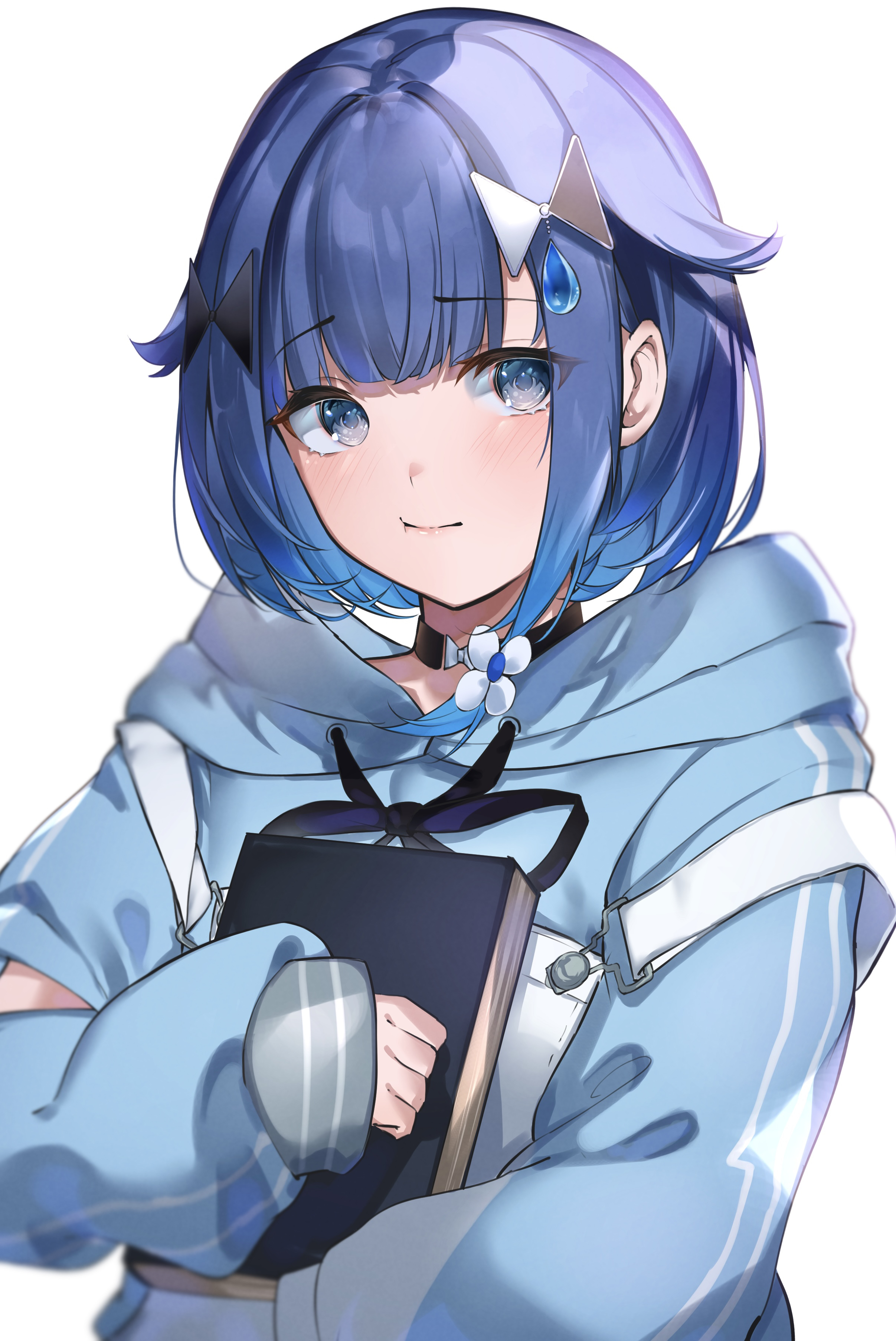 1girl absurdres blue_eyes blue_hair blue_jacket blush book commentary_request gem_hair_ornament hair_flaps highres holding holding_book hood hood_down hooded_jacket hugging_book hugging_object jacket long_sleeves looking_at_viewer pout puffy_long_sleeves puffy_sleeves ringozeri short_hair simple_background sleeves_past_wrists solo tsumugi_kokage tsumugi_kokage_(1st_costume) upper_body virtual_youtuber vspo! water_drop_hair_ornament white_background