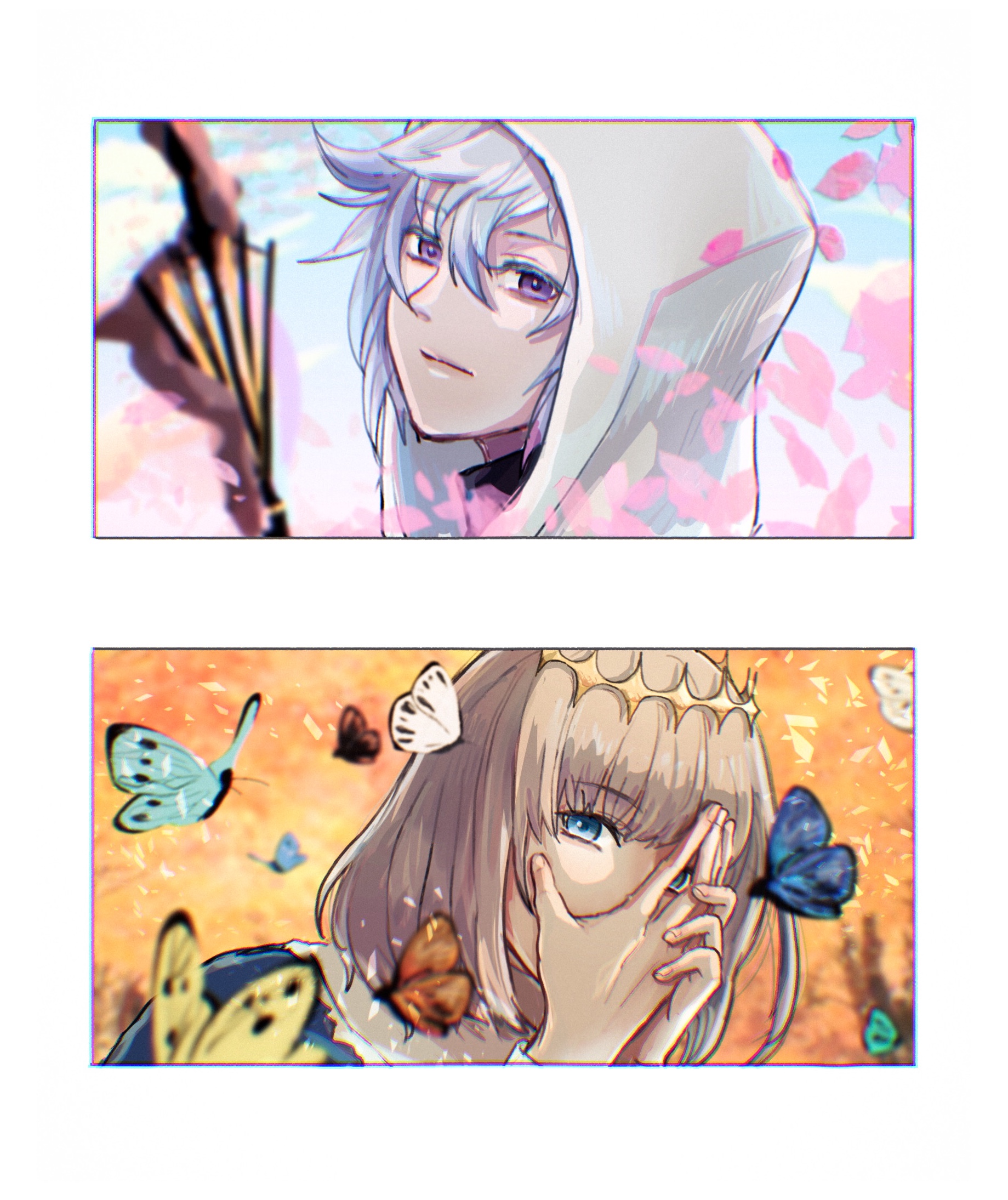 2boys blue_butterfly blue_eyes brown_hair bug butterfly closed_mouth covered_mouth diamond_hairband fate/grand_order fate_(series) green_butterfly grey_hair hands_on_own_face highres hood hood_up insect looking_at_viewer makkura_(gloe) male_focus medium_hair merlin_(fate) multiple_boys oberon_(fate) oberon_(first_ascension)_(fate) orange_butterfly petals pink_petals purple_eyes staff white_butterfly white_hood yellow_butterfly