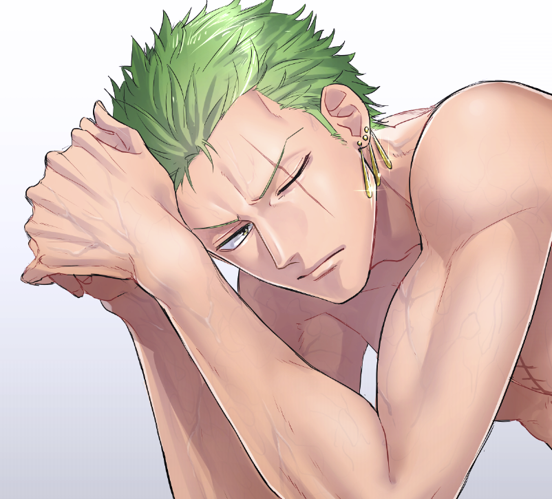 1boy closed_mouth commentary_request earrings glint gradient_background green_hair jewelry male_focus nakumonaga_uma one_eye_closed one_piece roronoa_zoro scar scar_across_eye scar_on_face short_hair simple_background solo stitched_torso stitches topless_male upper_body v-shaped_eyebrows veins
