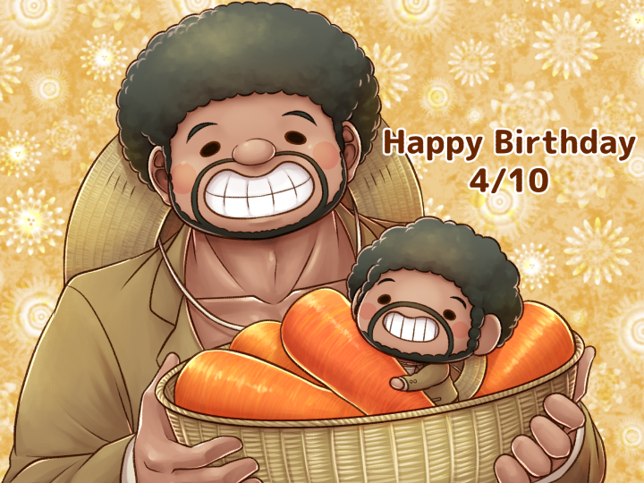 2boys afro bandai_daisaku basket black_eyes black_hair blazer blush_stickers brown_jacket buttons carrot chibi clone collarbone collared_jacket commentary_request danganronpa_(series) danganronpa_3_(anime) dark-skinned_male dark_skin dated english_text floral_background grin happy_birthday hat hat_on_back holding holding_basket in_basket in_container jacket lapels layered_sleeves long_sleeves looking_at_viewer male_focus multiple_boys notched_lapels shirt short_hair simple_background smile solid_oval_eyes straw_hat upper_body white_shirt yellow_background yellow_hat yumaru_(marumarumaru)