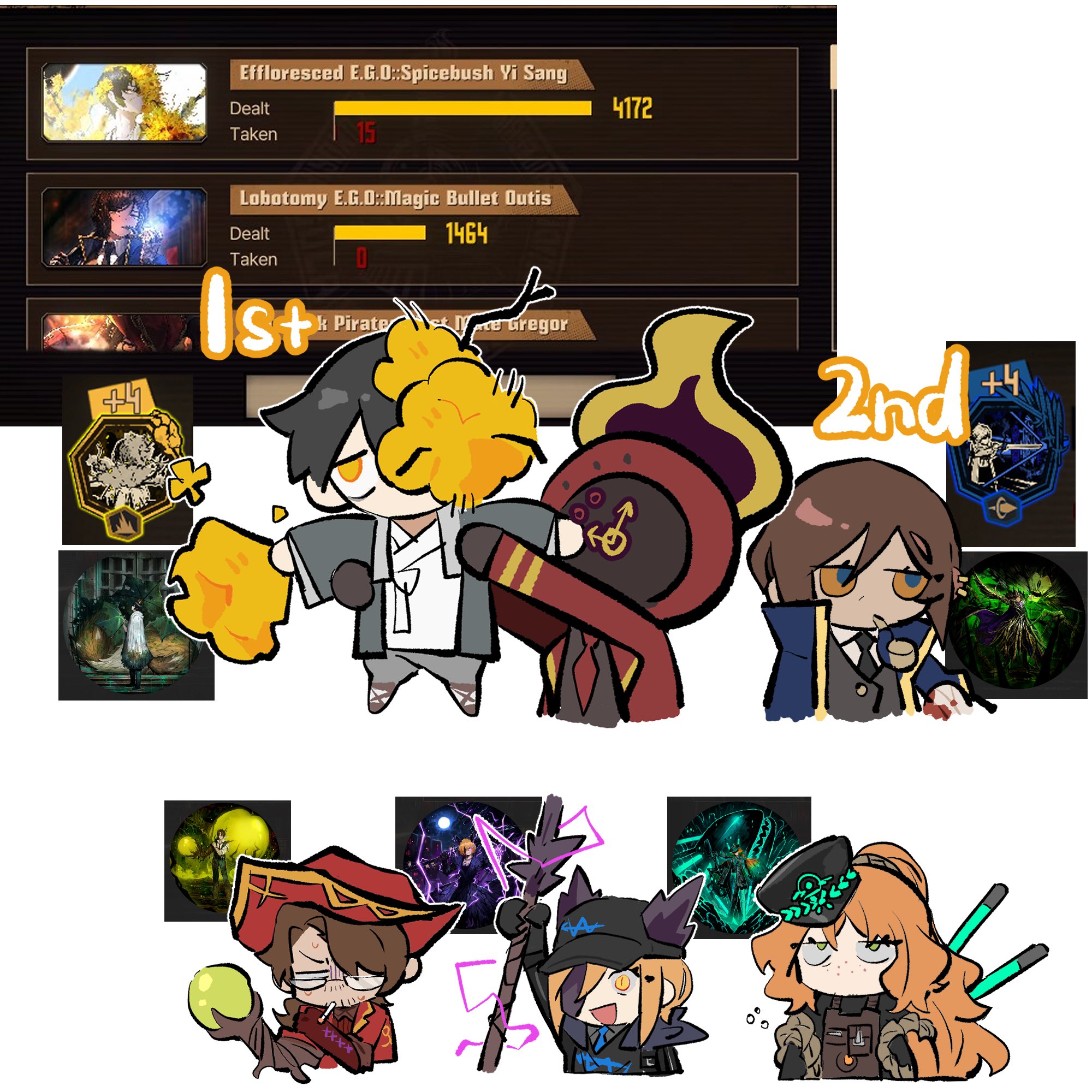 1other 2boys 3girls animal_ears black_coat black_hair blind_obsession_(e.g.o) blonde_hair blue_cape cape coat dante_(limbus_company) don_quixote_(project_moon) e.g.o_(project_moon) ebony_stem_(e.g.o) english_text game_screenshot_inset gameplay_mechanics gregor_(project_moon) hanbok hat high_ponytail highres ishmael_(project_moon) korean_clothes legerdemain_(e.g.o) limbus_company long_hair magic_bullet_(e.g.o) multiple_boys multiple_girls open_mouth orange_hair outis_(project_moon) pirate_hat ponytail project_moon red_hat simple_background smile smoking_pipe south_ac spicebush_(e.g.o) sunshower_(e.g.o) telepole_(e.g.o) very_long_hair w_corp._(identity)_(project_moon) white_background white_hanbok wolf_ears yellow_eyes yi_sang_(project_moon)