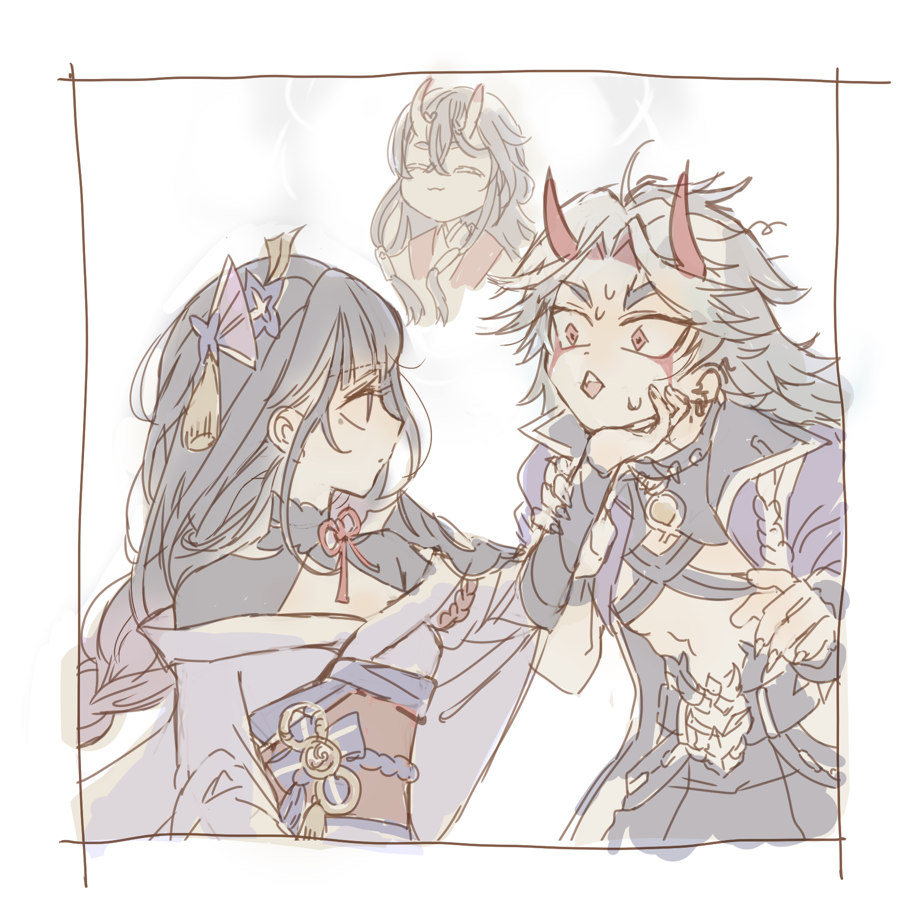 1boy 2girls arataki_itto arm_up blunt_bangs braid chiyo_(genshin_impact) closed_eyes closed_mouth collared_coat earrings fingernails from_side genshin_impact grabbing_another's_arm hair_between_eyes hair_flowing_over hair_ornament hand_on_another's_chin hands_up highres horns japanese_clothes jewelry kanai23831347 long_hair looking_at_another mole mole_under_eye multiple_girls neck_ribbon open_mouth purple_eyes purple_hair raiden_shogun red_horns ribbon sharp_fingernails simple_background single_braid single_earring standing sweat white_background white_hair