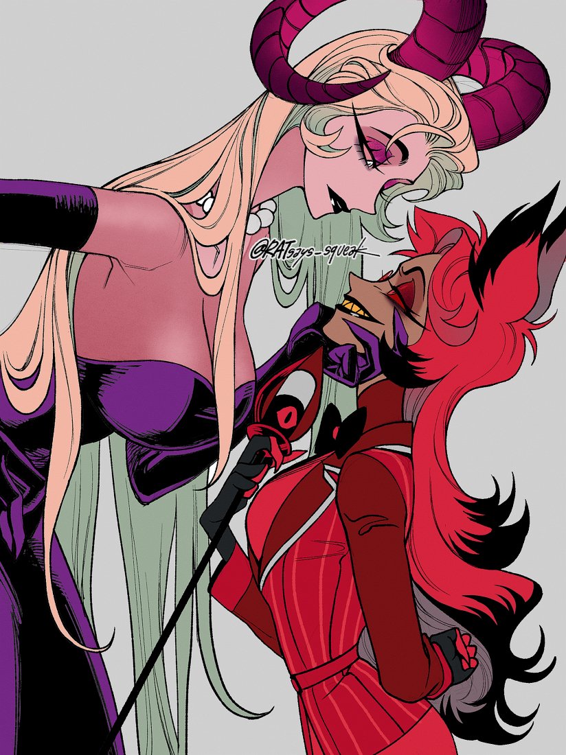 2girls alastor_(hazbin_hotel) blonde_hair breasts demon_girl demon_horns dress face-to-face formal_clothes genderswap genderswap_(mtf) hazbin_hotel hellaverse horns large_breasts lilith_(hazbin_hotel) long_hair multiple_girls purple_dress ratsays_squeak red_hair suit very_long_hair