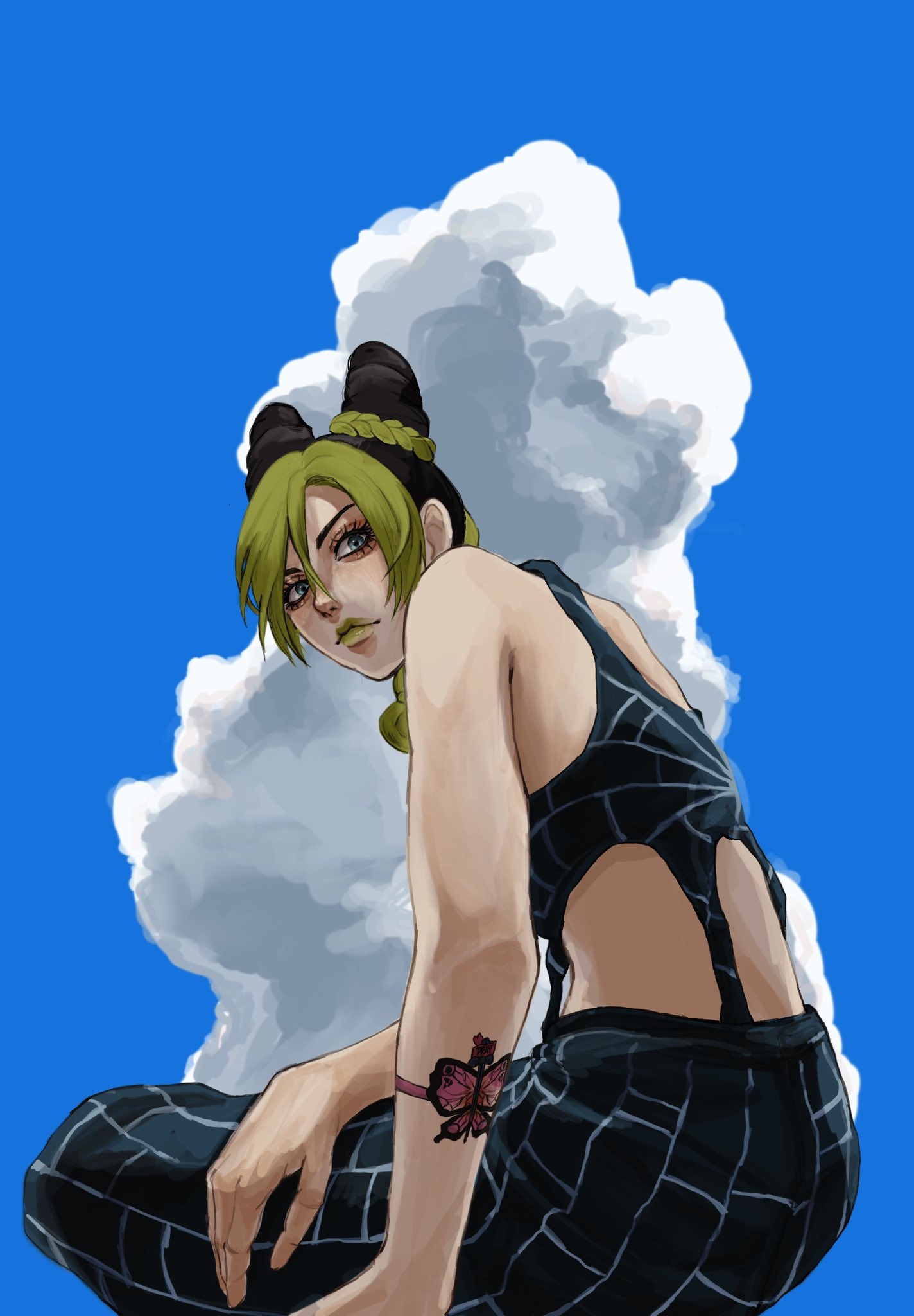 1girl braid bun_with_braided_base butterfly_tattoo cone_hair_bun double_bun green_lips hair_bun highres jojo_no_kimyou_na_bouken kuujou_jolyne long_hair multicolored_hair smile solo spider_web_print stone_ocean tattoo two-tone_hair umeko_(00_nro9) y2k_fashion