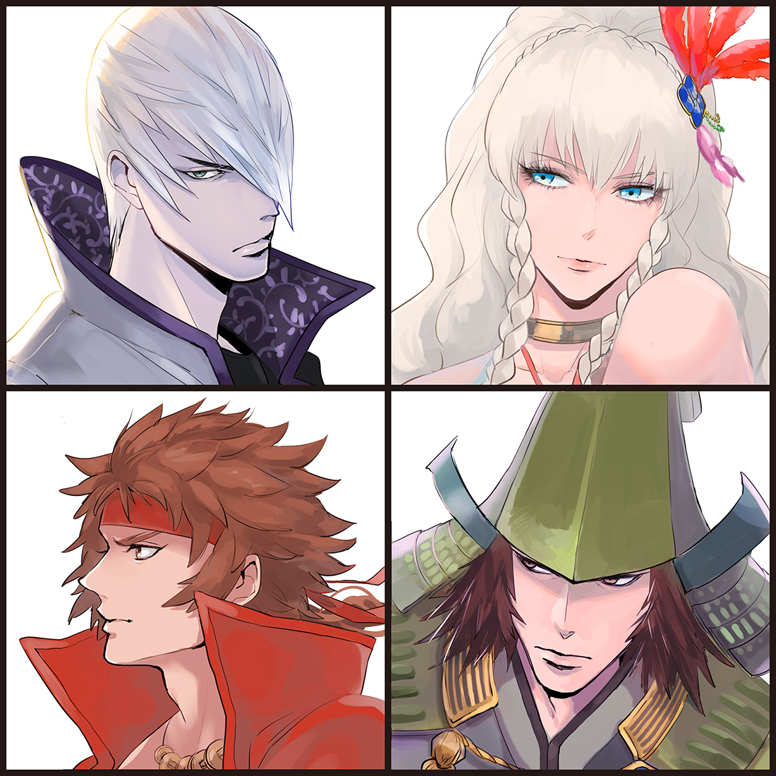 1girl 3boys black_border blonde_hair blue_eyes border braid brown_eyes brown_hair crown_braid green_eyes ishida_mitsunari_(sengoku_basara) kyougoku_maria_(sengoku_basara) long_hair looking_ahead looking_at_viewer looking_to_the_side male_focus medium_hair mouri_motonari_(sengoku_basara) multiple_boys portrait sanada_yukimura_(sengoku_basara) sengoku_basara short_hair sidelocks simple_background white_background white_hair yori_(ito_haruki)