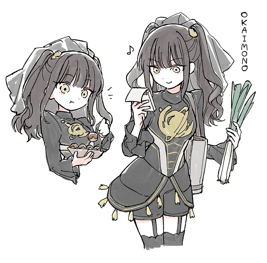 1girl black_dress black_thighhighs brown_hair commentary dress eating food garter_straps holding holding_food holding_spring_onion holding_vegetable kamen_rider kamen_rider_gotchard_(series) lachesis_(kamen_rider_gotchard) long_sleeves looking_at_viewer m4k3inu puffy_long_sleeves puffy_sleeves simple_background smile solo spring_onion thighhighs two_side_up vegetable white_background