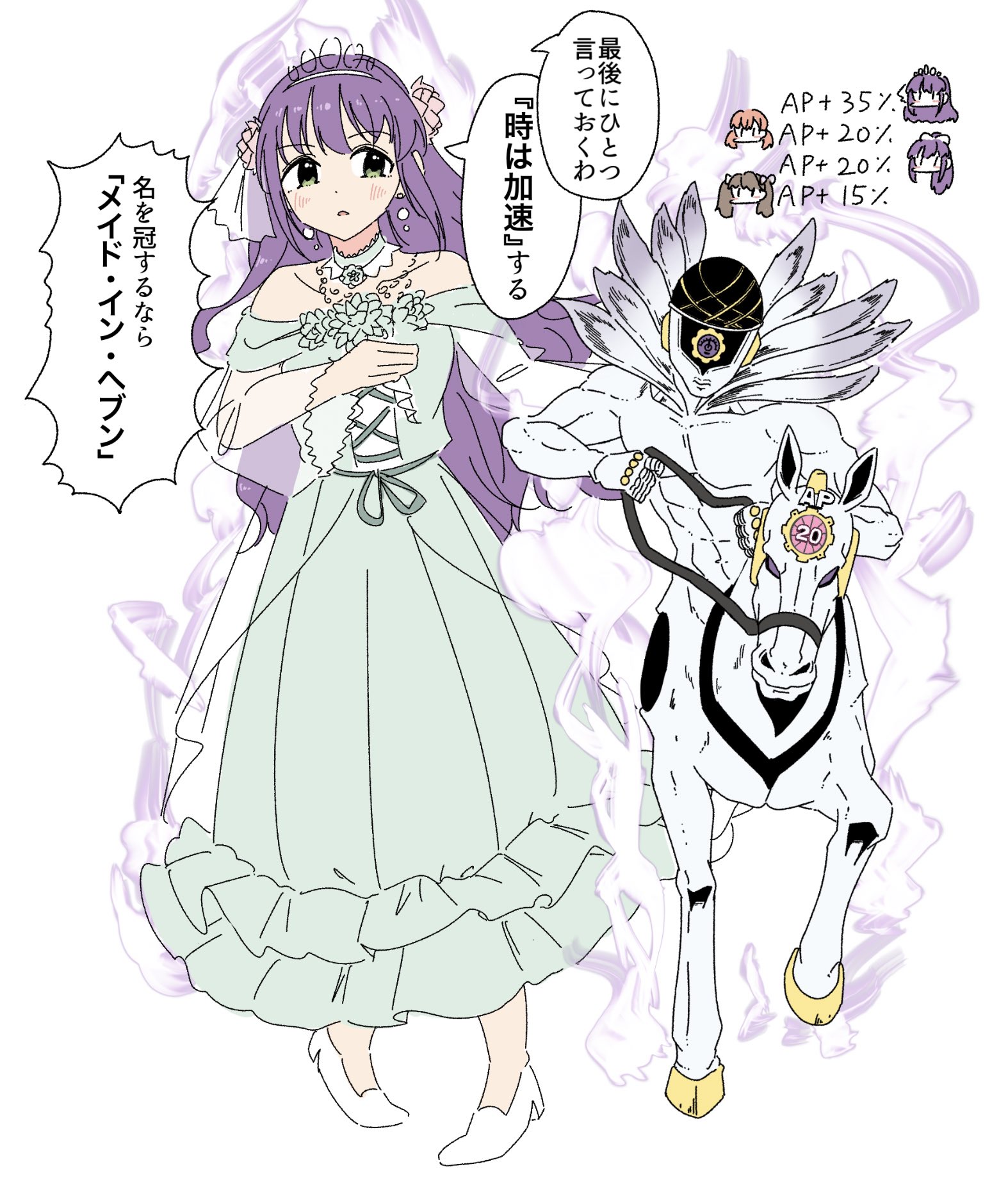 1girl collarbone commentary_request crossover dress flower frilled_dress frills full_body green_dress green_eyes hair_flower hair_ornament high_heels highres jojo_no_kimyou_na_bouken link!_like!_love_live! llkapital long_dress long_hair long_sleeves lotus love_live! made_in_heaven_(stand) off-shoulder_dress off_shoulder official_alternate_costume open_mouth otomune_kozue otomune_kozue_(kiseki_no_butoukai_(102nd)) pink_flower purple_hair see-through_clothes see-through_sleeves simple_background stand_(jojo) stone_ocean tiara translation_request virtual_youtuber white_background white_footwear