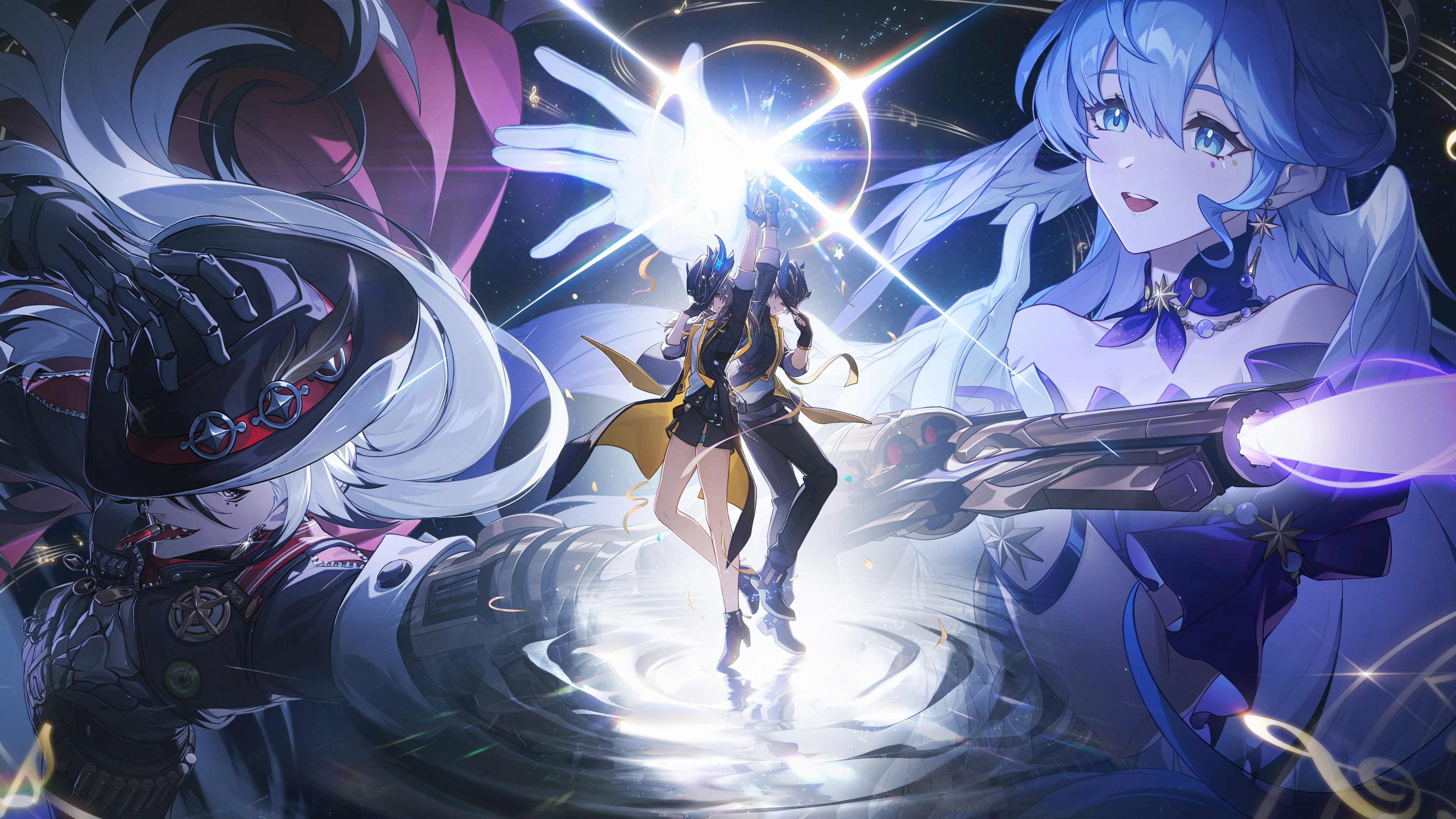 2boys 2girls absurdres arm_up armor back-to-back bare_shoulders belt black_belt black_coat black_footwear black_gloves black_hair black_hat black_jacket black_pants black_skirt blue_eyes blue_hair boothill_(honkai:_star_rail) boots caelus_(honkai:_star_rail) closed_mouth coat collarbone detached_sleeves dress elbow_gloves feathered_wings fingerless_gloves flying full_body gloves grey_eyes grey_hair gun hair_between_eyes halo hand_on_headwear hand_up handgun hat hat_feather head_wings high_heels highres holding holding_gun holding_weapon honkai:_star_rail honkai_(series) hood hooded_jacket index_finger_raised jacket jewel_under_eye light long_hair long_sleeves looking_at_another looking_at_viewer multicolored_hair multiple_boys multiple_girls musical_note open_clothes open_coat open_mouth pants pocket_watch purple_dress robin_(honkai:_star_rail) sharp_teeth shirt short_hair short_sleeves skirt smile star_(symbol) star_ornament stelle_(honkai:_star_rail) t-shirt teeth tongue tongue_out trailblazer's_hat_(honkai:_star_rail) trailblazer_(honkai:_star_rail) two-sided_coat two-sided_fabric two-sided_jacket two-tone_dress two-tone_hair watch weapon white_dress white_gloves white_hair white_shirt wings yellow_coat yellow_jacket zhiyan_li