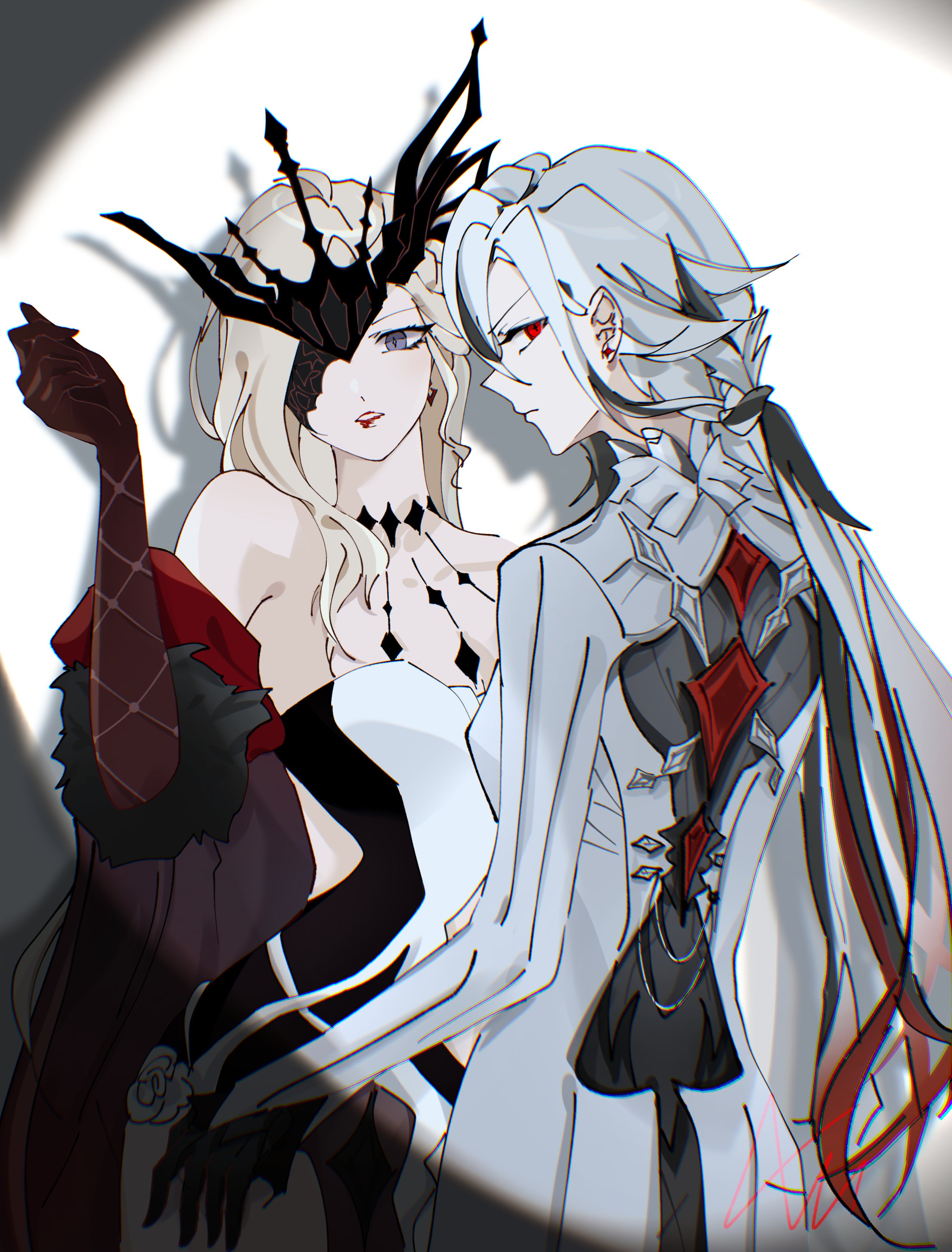 2girls absurdres arlecchino_(genshin_impact) bare_shoulders black_hair black_mask blonde_hair blue_eyes cape coat colored_extremities dress earrings elbow_gloves fishnet_gloves fishnets fur_trim genshin_impact gloves grey_coat half_mask highres jewelry lipstick long_hair long_sleeves looking_at_viewer low_ponytail makeup mask mask_over_one_eye multicolored_hair multiple_girls off-shoulder_dress off_shoulder one_eye_covered ponytail red_cape red_eyes red_lips red_pupils signora_(genshin_impact) spotlight streaked_hair studded_gloves symbol-shaped_pupils two-tone_hair upper_body white_hair whyenyu yuri
