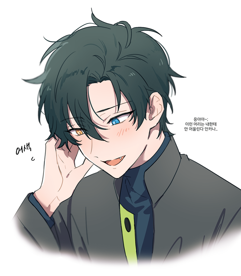 1boy blue_eyes blush commentary_request ensemble_stars! fang green_hair hand_up heterochromia kagehira_mika korean_commentary korean_text long_sleeves male_focus open_mouth orange_eyes round_o0 short_hair simple_background solo sweater translation_request turtleneck turtleneck_sweater upper_body white_background