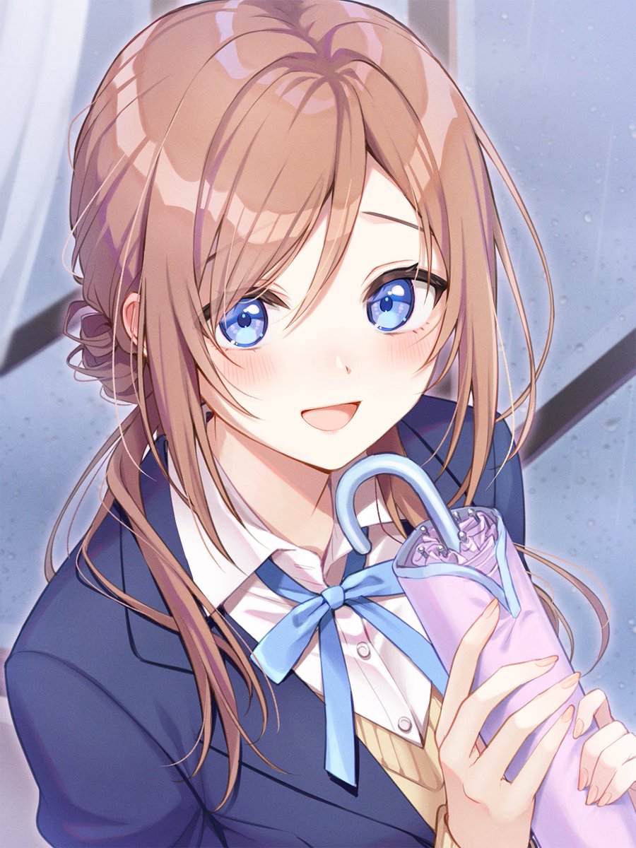 1girl blazer blue_eyes blue_jacket blue_ribbon blush brown_hair commentary_request courreges_ace gakuen_idolmaster hair_bun hatsuboshi_gakuen_school_uniform highres himesaki_rinami holding holding_umbrella idolmaster jacket long_hair looking_at_viewer neck_ribbon ribbon school_uniform shirt single_side_bun smile solo sweater umbrella upper_body white_shirt yellow_sweater