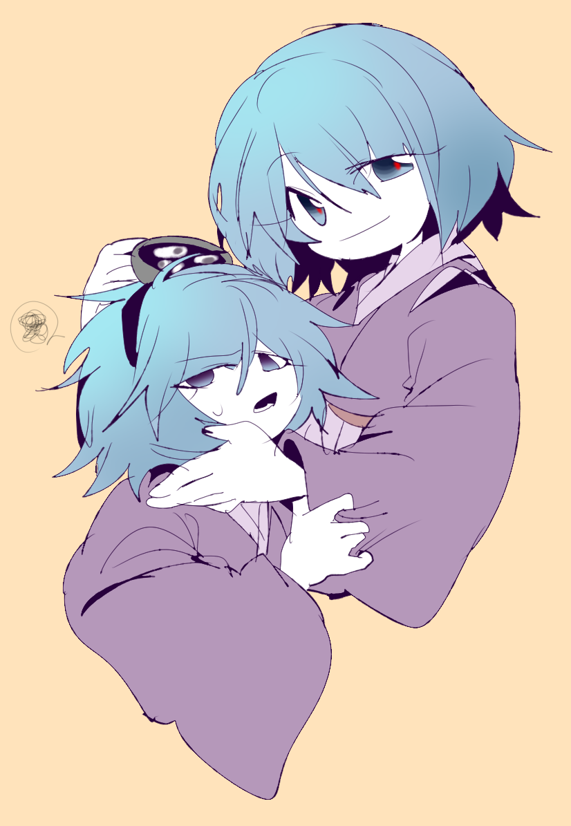 2others androgynous black_hairband blue_eyes blue_hair chinese_commentary closed_mouth clothes_grab colored_skin commentary_request dual_persona hairband japanese_clothes kimono len'en ling_s long_sleeves lower_teeth_only multiple_others no_nose obi open_mouth other_focus purple_kimono red_pupils sash short_hair simple_background skirt grabbing_another's_sleeve smile spoken_squiggle squiggle sweat teeth terumi_(len'en) white_skin yellow_background