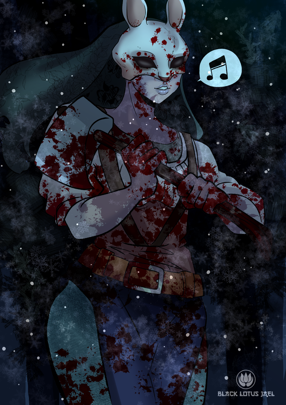 animal_ears axe belt blood blood_splatter brown_belt dead_by_daylight fake_animal_ears highres huntress mask shirt snowflakes tagme white_shirt